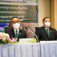 ด้าน นายสุกิจ จันทร์ทอง ผู้อำนวยการการองค์การอุตสาหกรรมป่าไม้ (ผอ.อ.อ.ป.) เปิดเผยว่า การลงนามในบันทึกข้อตกลงความร่วมมือการส่งเสริมการทำสวนยางอย่างยั่งยืนตามมาตรฐานในระดับสากล และการบริหารจัดการลดก๊าซเรือนกระจกจากสวนยางพารา เป็นความร่วมมือเชิงยุทธศาสตร์ ที่มุ่งเน้นดำเนินตามพันธกิจของรัฐวิสาหกิจ ของ อ.อ.ป. และ กยท. ซึ่งการลงนามในครั้งนี้ มีวัตถุประสงค์ร่วมกัน เป็นการแลกเปลี่ยน องค์ความรู้ นวัตกรรม และพัฒนาศักยภาพด้านการจัดการสวนยางพาราอย่างยั่งยืนตามมาตรฐานในระดับสากล ให้ได้ตามมาตรฐาน FSCTM, PEFCTM ตลอดจนแลกเปลี่ยนองค์ความรู้ นวัตกรรมและพัฒนาศักยภาพด้านการบริหารจัดการการลดก๊าซเรือนกระจกจากสวนยางพารา และสร้างโอกาสในธุรกิจคาร์บอนเครดิตจากสวนยางพารา