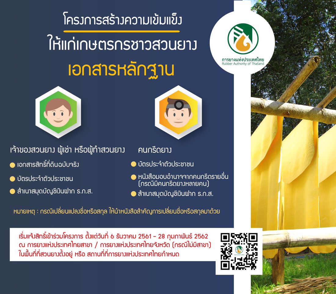 คณะรัฐมนตรีได้อนุมัติให้การยางแห่งประเทศไทย (กยท.) ดำเนินโครงการสร้างความเข้มแข็งให้แก่เกษตรกรชาวสวนยาง เพื่อบรรเทาความเดือดร้อนของเกษตรกรชาวสวนยาง และคนกรีดยาง โดยให้ความช่วยเหลือเกษตรกรตามพื้นที่เปิดกรีดจริง 1,800 บาท/ไร่ ไม่เกิน 15 ไร่/ราย หากมีคนกรีดยางจะแบ่งจ่าย 2 ส่วน คือ ให้เจ้าของสวนยาง ผู้เช่าหรือผู้ทำสวนยาง 1,100 บาท/ไร่ เพื่อเพิ่มประสิทธิภาพการผลิต/ปรับปรุงคุณภาพผลผลิต และให้คนกรีดยาง 700 บาท/ไร่ เพื่อเป็นค่าครองชีพ เกษตรกรที่เข้าร่วมโครงการฯ ต้องเป็นเกษตรกรชาวสวนยางที่มีสวนยางในพื้นที่มีเอกสารสิทธิ์ที่เปิดกรีดแล้ว และขึ้นทะเบียนกับ กยท. ก่อนวันที่ 14 พฤศจิกายน 2561 จำนวน 999,065 ราย และคนกรีดยาง 304,266 ราย คิดเป็นพื้นที่ 9,448,447 ไร่ หากคุณสมบัติผ่านตามหลักเกณฑ์โครงการฯ จะดำเนินการจ่ายเงินผ่านบัญชีเงินฝาก ธ.ก.ส. ของชาวสวนยาง โดยจะเริ่มตั้งแต่วันที่ 6 ธ.ค. 61 28 ก.พ. 62