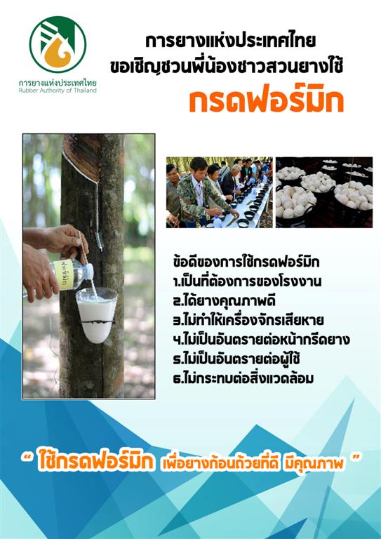 ตลอดระยะเวลาที่ผ่านมา กยท. ยืนยัน ได้รณรงค์ไม่ให้ใช้กรดดังกล่าว และสามารถลดการใช้กรดดังกล่าวลงกว่าร้อยละ 40 และเชื่อว่าจะหมดไปในอีก 2 ปีข้างหน้า ส่วนปริมาณการผลิตในพื้นที่ภาคตะวันออกเฉียงเหนือขณะนี้มีประมาณ 573,000 ตันและมีพื้นที่ปลูกยางล่าสุด จำนวน 4,726,466 ไร่ เปิดกรีดแล้ว 3,240,734 ไร่ และคาดว่าจะเพิ่มสูงขึ้น จึงอยากแนะนำให้เกษตรกรหันมาใช้กรดฟอร์มิก เพื่อไม่ให้เกิดปัญหาด้านคุณภาพยางและฉุดราคายางจนเป็นปัญหาในระยะยาว