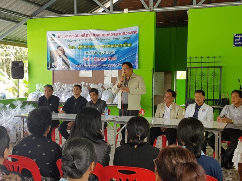 วันที่ (7 ธันวาคม 2559)กยท. ร่วมกับ ผู้นำเกษตรกร สถาบันเกษตรกร และหน่วยงานปกครองใน จ.พัทลุง รุดลงพื้นที่มอบถุงยังชีพ บรรเทาความเดือดร้อน แก่พี่น้องเกษตรกรชาวสวนยาง จ.พัทลุง ซึ่งได้รับผลกระทบจากภัยพิบัติน้ำท่วม ในเบื้องต้น มีเกษตรชาวสวนยางที่ได้รับความเดือดร้อนจากอุทกภัยในครั้งนี้ประมาณ 17,000 ราย ซึ่งจากการสำรวจพื้นที่สวนยางที่ได้รับความเสียหายประมาณ 105,944 ไร่ ครอบคลุม 11 อำเภอใน จ.พัทลุง