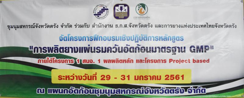 วันที่ 29 – 31 มกราคม 2561 ชุมนุมสหกรณ์จังหวัดตรัง จำกัด ร่วมกับสำนักงานธนาคารเพื่อการเกษตรและสหกรณ์การเกษตรจังหวัดตรัง และการยางแห่งประเทศไทย ได้จัดทำโครงการฝึกอบรมเชิงปฏิบัติการหลักสูตร การผลิตยางแผ่นรมควันอัดก้อนมาตรฐาน GMP ณ โรงอัดก้อนยางชุมนุมสหกรณ์จังหวัดตรัง จำกัด โดยได้เชิญอาจารย์ปรีดิ์เปรม ทัศนกุล พร้อมคณะ GMP จากศูนย์บริการทดสอบรับรองภาคใต้ ร่วมเป็นวิทยากร และมีนายณรงค์ศักดิ์ เขียวไชย ผู้จัดการสำนักงานธกส.จังหวัดตรัง เป็นประธานในพิธีเปิดการอบรมในครั้งนี้