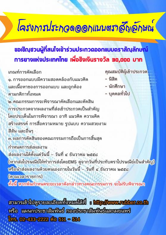 กยท. จัดประกวด LOGO การยางแห่งประเทศไทย สร้างภาพลักษณ์องค์กรใหม่ บริหารจัดการยางพาราทั้งระบบ การยางแห่งประเทศไทย(กยท.) จัดกิจกรรมการประกวดรูปลักษณะของตราเครื่องหมายใหม่ขององค์กร เพื่อเป็นสื่อกลางในการแสดงถึงเป้าหมาย และสร้างภาพลักษณ์ให้การยางแห่งประเทศไทย เป็นที่รู้จักในฐานะองค์กรใหม่ที่จัดตั้งขึ้นเพื่อบริหารจัดการยางพาราทั้งประเทศอย่างเป็นระบบ โดยเปิดโอกาสให้นิสิต นักศึกษา และบุคคลทั่วไป ได้มีส่วนร่วมออกแบบตราสัญลักษณ์ฯ กันอย่างกว้างขวาง พร้อมด้วยเงินรางวัลชนะเลิศกว่า 30,000 บาท ทั้งนี้เริ่มส่งผลงานได้แล้ว ตั้งแต่ บัดนี้จนถึงวันที่ 4 ธ.ค. 2558 ** สามารถดาวน์โหลดรายละเอียดโครงการประกวดรูปลักษณะของตราเครื่องหมายการยางแห่งประเทศไทย (LOGO)ได้ที่นี่ ** ข่าวประชาสัมพันธ์ กยท.