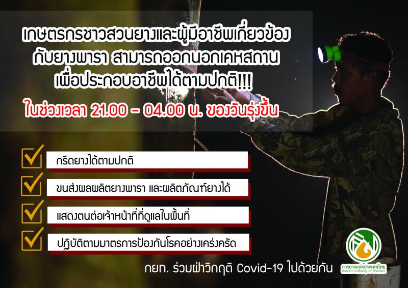การยางแห่งประเทศไทย (กยท.) ย้ำชัด ชาวสวนยางและผู้มีอาชีพเกี่ยวข้องกับยางพาราได้รับการยกเว้นให้สามารถออกนอกเคหสถานเพื่อประกอบอาชีพ ในเวลาตั้งแต่ 3 ทุ่ม - ตี 4 ได้ เพียงปฏิบัติตามมาตรการป้องกันโรคอย่างเคร่งครัด