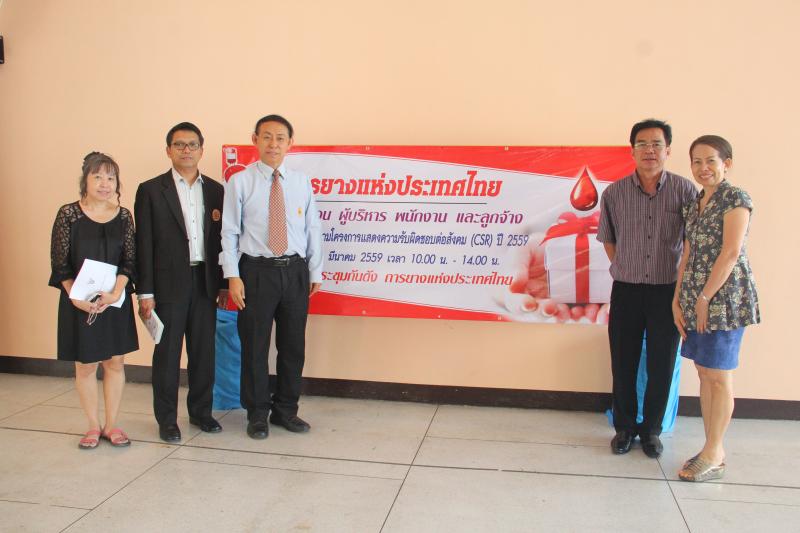 เมื่อวันที่ 31 มีนาคม 2559 การยางแห่งประเทศไทย จัดกิจกรรมบริจาคโลหิตตามโครงการแสดงความรับผิดชอบต่อสังคม (CSR) ปี 2559 ณ ห้องประชุมกันตัง การยางแห่งประเทศไทย เพื่อเป็นการแสดงจิตสำนึกสาธารณะ ส่งเสริมด้านคุณธรรมและจริยธรรมของผู้บริหาร พนักงานและลูกจ้างเป็นการบำเพ็ญประโยชน์ทั้งทางตรงและทางอ้อมในการให้ต่อผู้อื่น ในการนี้ ดร.ธีธัช สุขสะอาด ผู้ว่าการการยางแห่งประเทศไทย มาร่วมให้กำลังใจพนักงาน พร้อมด้วยนายสุรพล จารุพงศ์ ผู้ตรวจราชการกระทรวงเกษตรและสหกรณ์ ในฐานะประธานคณะอนุกรรมการ CG เข้าร่วมบริจาคโลหิตในครั้งนี้ด้วย