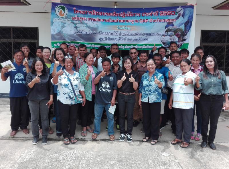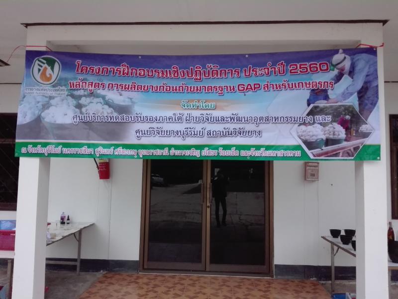 เมื่อวันที่ 7 มิถุนายน 2560 ศูนย์บริการทดสอบรับรองภาคใต้ ฝ่ายวิจัยและพัฒนาอุตสาหกรรมยาง ร่วมกับศูนย์วิจัยยางบุรีรัมย์ สถาบันวิจัยยาง ได้จัดอบรมเชิงปฏิบัติการ การผลิตยางก้อนถ้วยมาตรฐาน GAP สำหรับเกษตรกร ณ กลุ่มตูมใหญ่ อ. คูเมือง จ. บุรีรัมย์ เป็นรุ่นที่ 2 จากจำนวน 10 รุ่นทางภาคอีสานตอนล่าง ให้กับผู้นำเกษตรกรรุ่นละ 20 คน ซึ่งแต่ละคนที่เป็นแกนนำมีความตั้งใจที่จะนำความรู้ไปพัฒนาการผลิตให้ได้ระบบการจัดการที่มีคุณภาพให้ครอบคลุมการดูแลจัดการสวนยาง ระบบกรีด การผลิต การเก็บเกี่ยว การประเมินเนื้อยางแห้ง ตลอดจนการจัดเก็บและการขนส่งที่ถูกวิธี พร้อมส่งให้กับโรงงานแปรรูปยาง ในการผลิตผลิตภัณฑ์ที่ต้องการวัตถุดิบเกรด premium