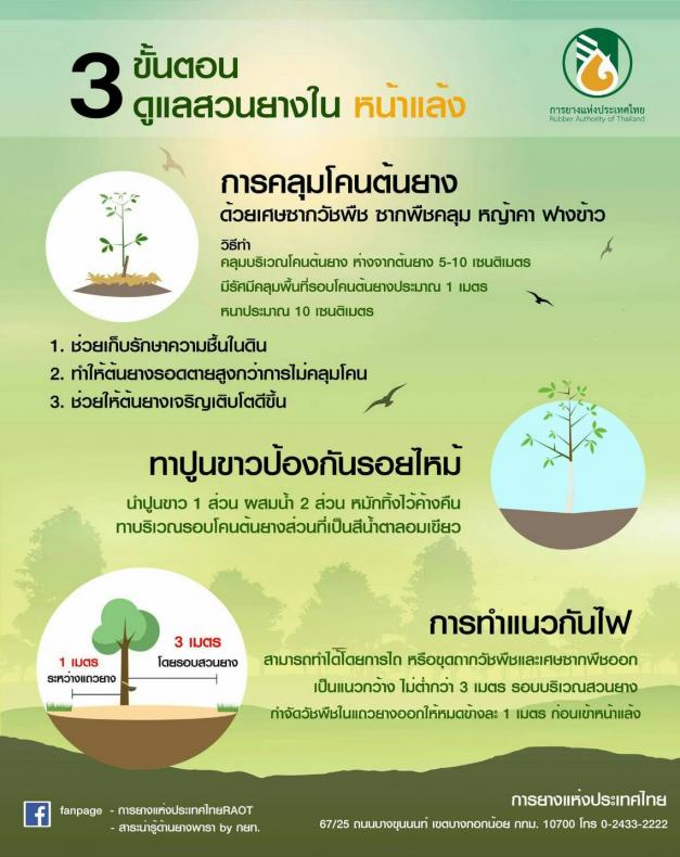 นายณรงศักดิ์ ใจสมุทร ผู้อำนวยการฝ่ายส่งเสริมและพัฒนาการผลิต กล่าวว่า กยท. มีความห่วงใยต่อเกษตรกรชาวสวนยางในการดูแลสวนยางในช่วงหน้าแล้ง ซึ่งเป็นช่วงที่อากาศร้อน และมีแสงแดดแรง เป็นสาเหตุทำให้ดินแห้งและส่งผลกระทบต่อต้นยางพารา เกษตรกรจึงควรให้ความสำคัญในการดูแลสวนยาง โดยเฉพาะอย่างยิ่งสวนยางปลูกใหม่ และสวนยางเล็ก ที่มีอายุไม่เกิน 3 ปี เนื่องจากในต้นยางอ่อนที่รับแดดแรงติดต่อกันเป็นเวลานาน จะส่งผลให้เซลล์เนื้อเยื่อส่วนที่รับแสงแดดไหม้เสียหาย และเจริญเติบช้ากว่าปกติ แนะนำให้เกษตรกรใช้ปูนขาวผสมน้ำอัตรา 1:2 ทิ้งไว้ 1 คืน แล้วทาบริเวณลำต้นสูงจากพื้นดินประมาณ ๑ เมตร เพื่อช่วยป้องกันความร้อนจากแสงแดด ป้องกันการสูญเสียน้ำของต้นยาง และป้องกันโรคหรือแมลงที่อาจเข้าทำลายได้ในเวลาต่อมา กรณีเปลือกต้นยางบริเวณที่ถูกไฟไหม้แสดงอาการแตกออกมา ให้ใช้มีดคมๆ ปาดเอาส่วนที่เสียหายออก จากนั้นทายาป้องกันเชื้อรา และนำสารเคมีรักษาเนื้อไม้ทาซ้ำอีกครั้ง จะทำให้รอยแผลหายสนิทได้เร็วขึ้น ทั้งนี้ หากต้นยางในสวนได้รับความเสียหายเป็นจำนวนมาก จนไม่อาจรักษาหน้ายางได้เกิน 40% ของทั้งสวน เกษตรกรควรทำการปลูกใหม่