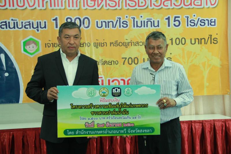 นายสุนันท์ กล่าวเพิ่มเติมว่า การนำร่องจ่ายเงินรอบแรกวันนี้เป็นการจ่ายเงินให้เกษตรกรชาวสวนยาง ทั้งที่เป็นเจ้าของสวนยาง ผู้เช่าสวนยาง ผู้ทำสวนยาง และคนกรีดยาง ผ่านบัญชี ธ.ก.ส. พร้อมกันทั่วประเทศ รวม 17 จังหวัด มียอดเงินรวมทั้งสิ้นกว่า 161.5 ล้านบาท โดยจ่ายให้แก่เกษตรกรชาวสวนยาง กว่า 19,000 ราย แบ่งเป็น เจ้าของสวนยาง (1,100 บาท/ไร่) จำนวน 9,740 ราย เจ้าของสวนยางกรีดเอง (700 บาท/ไร่) จำนวน 7,965 ราย และคนกรีดยาง 700 บาท/ไร่) จำนวน 1,313 ราย สำหรับจังหวัดสงขลาถือเป็นพื้นที่ซึ่งมีเกษตรกรได้รับเงินสนับสนุนจากโครงการฯ สูงที่สุดในรอบแรก เป็นเงินกว่า 62 ล้านบาท อย่างไรก็ตามการจ่ายเงินสนับสนุนให้ในวันนี้เป็นเพียงการเริ่มนำร่องเท่านั้น เกษตรกรชาวสวนยางรายอื่นๆ สามารถตรวจสอบรายชื่อและแจ้งสิทธิ์ขอเข้าร่วมโครงการฯ ได้