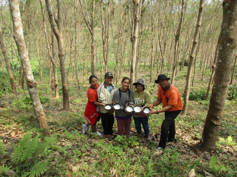 วันที่ 15 กุมภาพันธ์ 2562 คณะ GAP จากสถาบันวิจัยยาง นำโดยนางพิศมัย จันทุมา นักวิชาการเกษตร 8(ว) นายพรอนันต์ หม่อมนวล นักวิชาการเกษตร 3 ศูนย์วิจัยยางฉะเชิงเทรา และคณะ นายสุวิทย์ วงค์จักรคำ ผู้จัดการสหกรณ์เวียงแก่น จำกัด ลงพื้นที่หมู่ที่ 3 หมู่ 5 ต.หล่ายงาว อ.เวียงแก่น จ.เชียงราย เพื่อตรวจสวนยางเกษตรแปลงใหญ่ เพื่อเตรียมรับกับการจัดทำหลักปฏิบัติที่ดีสำหรับสวนยางมาตราฐาน GAP มีผู้เข้าร่วมโครงการจำนวน 21 ราย เป็นพันธุ์ RRIM 600 พื้นที่ 190 ไร่ พันธุ์ RRIT 251 พื้นที่ 20 ไร่ รวมพื้นที่ทั้งหมด 210 ไร่ อายุเฉลี่ย 12 ปี จากการที่ได้ลงพื้นที่พบปัญหาคือ เกษตรกรส่วนใหญ่ยังคงใช้น้ำกรดซัลฟูลริก ใช้ความเข้มข้นสูง จึงแนะนำให้ผสมกรดฟอร์มมิคเข้มข้นไม่เกิน 200 cc ต่อน้ำสะอาด 5 ลิตร มุมกรีดยังไม่ได้ 30 องศา ตามคำแนะนำ ยังไม่มีการชักร่องแบ่งเส้นด้านหน้าด้านหลังของรอยกรีด ไม่ควรเทน้ำเซรั่มบริเวณไกล้โคนต้นยาง ควรเทหรือสาดไปไกล ๆ ต้นยางในร่องยาง ปรับระยะระหว่างความยาวรอยกรีดถึงลิ้น 30 ซม. ระยะความยาวจากลิ้นถึงถ้วยยาง 15 ซม. ความสูงของรอยกรีดเมื่อขึ้นหน้าใหม่ควรเริ่มที่ระดับความสูง 150 ซม. หากความสูงเกิน 150 ซม. จากระดับพื้น แนะนำให้กรีดยางหน้าสูงอย่างระมัดระวัง การกรีดให้ลึกถึงเยื่อเจริญ แต่ไม่ควรกรีดยางหนาเกิน 2.5 มม. แนะนำจำนวนมีดกรีดไม่ควรเกินกว่า 4 มีดกรีด หลังจากที่ได้รับการแนะนำเพื่อเข้าสู่มาตราฐาน GAP ทางกลุ่มเกษตรกรมีเป้าหมายที่จะเข้าร่วมโครงการ เพื่อเตรียมรับการผลิตยางเครปที่มีคุณภาพมาตรฐาน GAP ต่อไป