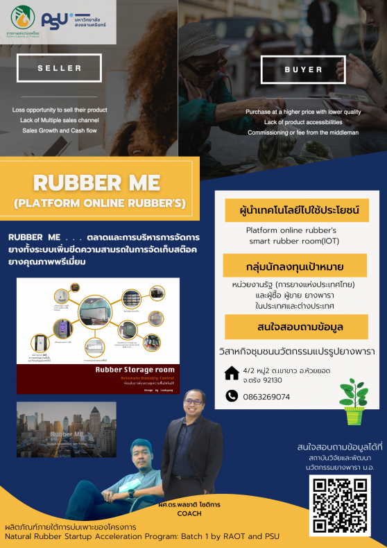 โครงการ Natural Rubber Startup Acceleration Program : Batch 1 กิจกรรม Pitching ผลงาน ซึ่งเป็นส่วนหนึ่งของโครงการส่งเสริมและพัฒนาเกษตรกรชาวสวนยาง สถาบันเกษตรกรชาวสวนยาง และผู้ประกอบกิจการยางไปสู่การเป็น Startup ด้านยางพารา ตามความร่วมมือของการยางแห่งประเทศไทย และสถาบันวิจัยและพัฒนานวัตกรรมยางพารา มหาวิทยาลัยสงขลานครินทร์ เพื่อสร้างความเข้มแข็งเพิ่มขีดความสามารถในการแข่งขัน ในโครงการพัฒนาด้านธุรกิจเทคโนโลยี นวัตกรรมสำหรับสถาบันเกษตรกรชาวสวนยาง และผู้ประกอบกิจการยางพารา โดยเมื่อวันที่ 15 กันยายน 2564 ที่ผ่านมา ได้มีการจัดกิจกรรมการ Pitching ผลงานนวัตกรรมจากยางพารา ผ่านระบบออนไลน์ วีดิโอคอนเฟอเรนซ์ และมีผู้ผ่านเข้ารอบเพื่อตัดสินผลงานจำนวน 11 ทีม