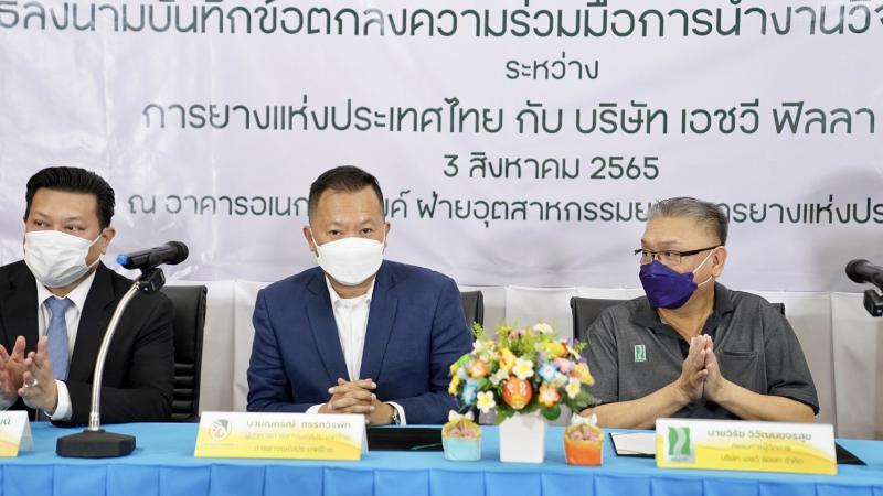 วันนี้ ( 3 สิงหาคม 2565 ) การยางแห่งประเทศไทย (กยท.) ร่วมกับ บริษัท เอชวี ฟิลลา จำกัด จัดพิธีลงนามบันทึกข้อตกลงความร่วมมือ (MOU) การนำงานวิจัยไปใช้ประโยชน์ เพื่อศึกษาสมบัติของน้ำยางข้นครีม ต่อยอดสูjอุตสาหกรรมเส้นด้ายยางยืด หวังลดต้นทุนการผลิตและเพิ่มประสิทธิภาพ ณ อาคารอเนกประสงค์ ฝ่ายอุตสาหกรรมยาง การยางแห่งประเทศไทย บางเขน กรุงเทพฯ
