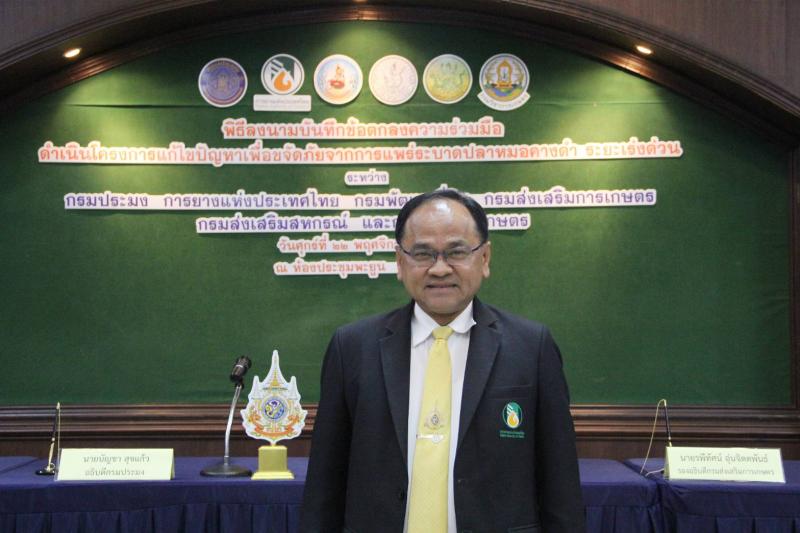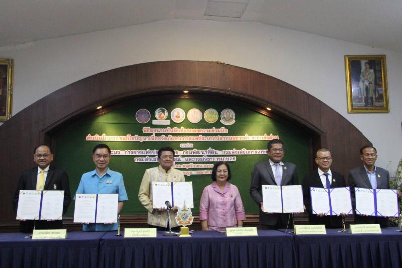 สำหรับพิธีลงนาม MOU "ดำเนินโครงการแก้ไขปัญหาเพื่อขจัดภัยจากการแพร่ระบาดปลาหมอคางดำ ระยะเร่งด่วน ในวันนี้ มีวัตถุประสงค์เพื่อเป็นการแสดงถึงความร่วมแรงร่วมใจของ 6 หน่วยงาน ที่มุ่งหมายที่จะขจัดปัญหาการระบาดของปลาหมอคางดำให้หมดไปจากแหล่งน้ำธรรมชาติของไทยและบ่อเพาะเลี้ยงสัตว์น้ำของเกษตรกร ซึ่งเป็นไปตามนโยบายของนายอัครา พรหมเผ่า รัฐมนตรีช่วยว่าการกระทรวงเกษตรและสหกรณ์ ที่มอบหมายให้กรมประมงเร่งขับเคลื่อนการแก้ไขปัญหาการระบาดของปลาหมอคางดำให้เป็นรูปธรรมและเห็นผลชัดเจน (ระยะเร่งด่วน) สามารถควบคุมให้อยู่ในพื้นที่จำกัดไม่กลับมาเกิดการระบาดอีกและอยู่ในระดับที่ไม่ส่งผลกระทบต่อระบบนิเวศและประชากรสัตว์น้ำพื้นเมืองในแหล่งน้ำ ดังนั้น กรมประมง ขานรับนโยบายและเร่งประสาน 6 หน่วยงานในสังกัดกระทรวงเกษตรและสหกรณ์ ประกอบด้วย กรมประมง การยางแห่งประเทศไทย กรมพัฒนาที่ดิน กรมส่งเสริมการเกษตร กรมส่งเสริมสหกรณ์ และกรมวิชาการเกษตร เพื่อบูรณาการร่วมกันที่จะดำเนินการดังกล่าว สำหรับบทบาทหน้าที่ของทั้ง 6 หน่วยงานภาคี จะดำเนินการตามความเหมาะสมของแต่ละหน่วยงาน โดยกรมประมงจะทำหน้าที่กำจัดปลาหมอคางดำให้หมดจากแหล่งน้ำธรรมชาติและบ่อเพาะเลี้ยงของเกษตรกรในพื้นที่ที่เกิดการระบาด และส่งมอบปลาหมอคางดำเหล่านี้ให้กับหน่วยงานต่าง ๆ เพื่อนำไปใช้ให้เกิดประโยชน์สูงสุด อาทิ การยางแห่งประเทศไทย กรมพัฒนาที่ดิน นำไปแปรรูปเป็นน้ำหมักชีวภาพ ส่วนกรมส่งเสริมสหกรณ์ กรมวิชาการเกษตร กรมส่งเสริมการเกษตร นำไปกำจัดตามกรรมวิธีที่เหมาะสม ควบคู่ไปกับการดำเนินการตามแผนปฏิบัติการ 7 มาตรการ แก้ไขปัญหาการแพร่ระบาดของปลาหมอคางดำของกรมประมง