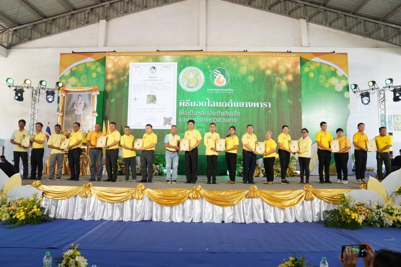 ดร.เพิก เลิศวังพง ประธานกรรมการการยางแห่งประเทศไทย กล่าวว่า โครงการรวมใจภักดิ์ หลอมรักษ์ สืบสานการพัฒนาที่ยั่งยืน เฉลิมพระเกียรติพระบาทสมเด็จพระเจ้าอยู่หัว กยท. ชู สวนยางอารยเกษตร คือการประกอบอาชีพทำสวนยางแบบผสมผสานสมดุลใน 3 ส่วน ได้แก่ "สืบสาน" ในสิ่งดี, "รักษา" ในสิ่งเดิม และ "ต่อยอด" สู่สิ่งใหม่ และเพื่อให้เกิด 3 สิ่ง คือ ความมั่นคง มั่งคั่ง ยั่งยืน ให้กับเศรษฐกิจ สังคม และสิ่งแวดล้อม โดยพื้นที่ของศูนย์วิจัยยางหนองคายจัดเป็นพื้นที่โชว์สวนยางอารยเกษตร ที่มุ่งสนับสนุนการทำสวนยางที่ลดต้นทุน ไปพร้อมกับการเพิ่มปริมาณผลผลิตยางให้แก่ชาวสวนยางอย่างเป็นรูปธรรม มีแปลงสาธิตต้นแบบแหล่งเรียนรู้ในการจัดการสวนยาง จำลองการใช้พื้นที่สวนยางอย่างเต็มประสิทธิภาพ โดยน้อมนำศาสตร์ของพระราชามาใช้เพื่อการพัฒนาอย่างยั่งยืนตามหลักเศรษฐกิจพอเพียงด้านการส่งเสริมสิ่งแวดล้อม และอนุรักษ์ทรัพยากรธรรมชาติ อีกทั้งเกษตรกรชาวสวนยางสามารถเรียนรู้การสร้างรายได้ระหว่างรอยางเปิดกรีด เพื่อเก็บเกี่ยวผลผลิตได้รับรายได้เสริมจากการทำเกษตรชนิดอื่นๆ ในพื้นที่ของตนเอง ควบคู่ไปกับการส่งเสริมการใช้เทคโนโลยีพันธุ์ยางใหม่ RRIT 3904 ซึ่งเป็นพันธุ์ยางที่คิดค้นและพัฒนาโดยสถาบันวิจัยยาง กยท. โดยพันธุ์ยางดังกล่าวมีความต้านทานต่อโรคทางใบและสามารถเก็บเกี่ยวผลผลิตในปริมาณที่มากขึ้น โดยภายในงานวันนี้ได้มีมอบพันธุ์ยางชำถุง พันธุ์ RRIT 3904 จำนวน 904 ต้น ให้กับผู้นำเกษตรกรชาวสวนยางในพื้นที่ พร้อมมอบโฉนดต้นยางพาราให้กับเกษตรกร จำนวน 20 ราย ซึ่งโฉนดต้นยางพาราจะสามารถระบุผู้ครอบครองต้นยางและที่ตั้งของต้นยางแต่ละต้น จำนวนพื้นที่ปลูก เปรียบเหมือนเอกสารสิทธิ์ความเป็นเจ้าของต้นยางต้นนั้น เกษตรกรที่ได้รับโฉนดต้นยางสามารถนำไปเป็นหลักประกันสินเชื่อเพื่อเข้าถึงแหล่งเงินทุนในการประกอบอาชีพและเพิ่มรายได้จากการซื้อขายแลกเปลี่ยนคาร์บอนเครดิตได้ รวมถึงได้สิทธิ์ในการรับความช่วยเหลือจากมาตรการของภาครัฐ ทั้งนี้ ข้อมูลต้นยางที่ได้จากการออกโฉนดต้นยางสามารถนำมาวิเคราะห์คาดการณ์ปริมาณยางที่จะออกสู่ตลาดในแต่ละช่วงเวลา เพื่อใช้วางแผนบริหารจัดการและแก้ปัญหายางทั้งระบบของ กยท. ได้อย่างมีประสิทธิภาพ