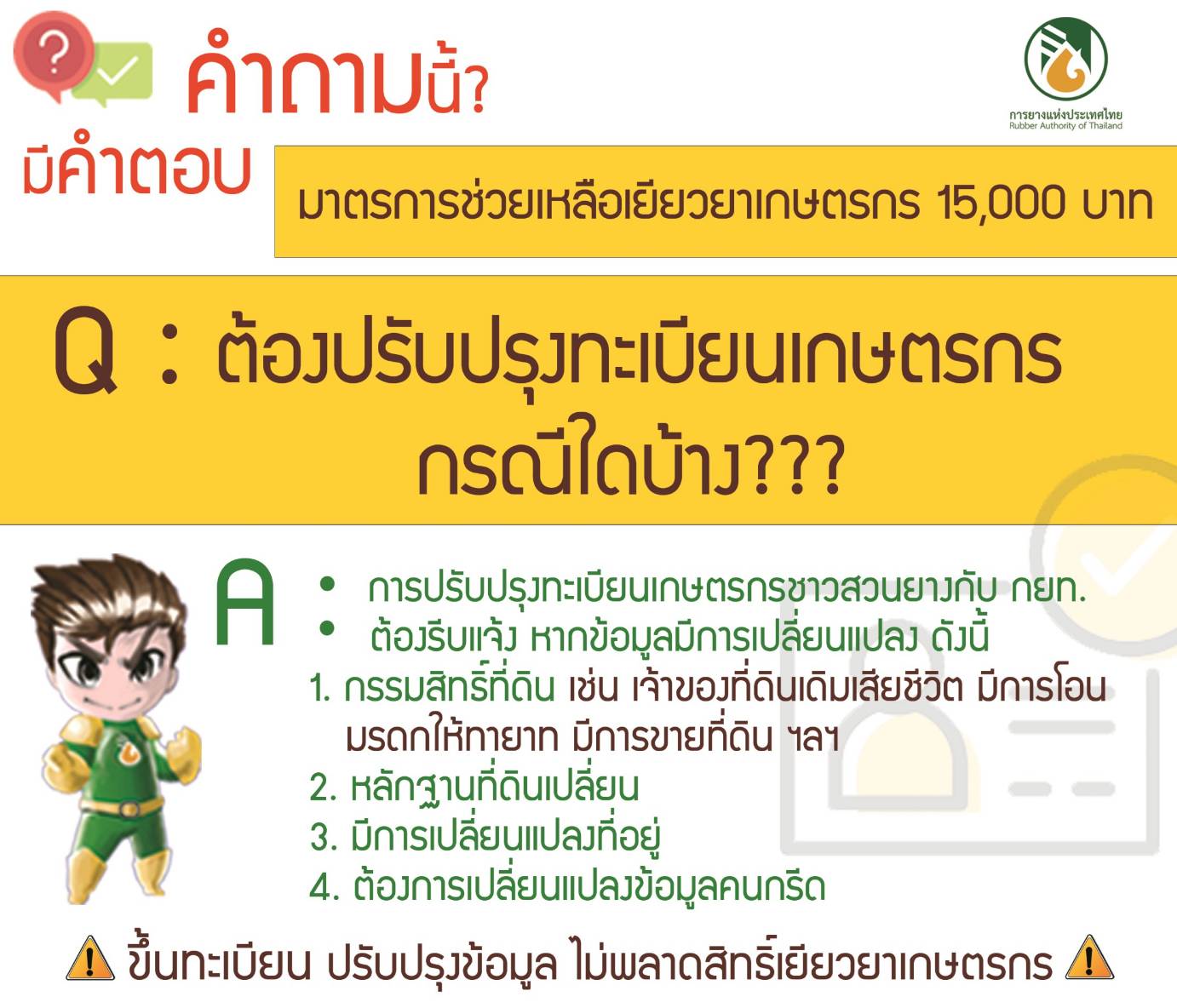 การยางแห่งประเทศไทย (กยท.) แนะนำเกษตรกรชาวสวนยาง เร่งขึ้นทะเบียน แจ้งข้อมูลปลูกยาง และปรับปรุงทะเบียนเกษตรกรกับ กยท.ในพื้นที่ใกล้บ้านไม่เว้นวันหยุด ภายใน 15 พฤษภาคม นี้ เพื่อเยียวยาเกษตรกรที่ได้รับผลกระทบจากการระบาดของไวรัสโคโรน่า 2019 (COVID-19) ตามนโยบายรัฐ นายขจรจักษณ์ นวลพรหมสกุล รองผู้ว่าการการยางแห่งประเทศไทยด้านบริหาร รักษาการแทนผู้ว่าการการยางแห่งประเทศไทย กล่าวว่า การประชุมคณะรัฐมนตรี เมื่อวันที่ 28 เมษายน 2563 มีมติให้กระทรวงเกษตรและสหกรณ์ จ่ายเงินเยียวยาเกษตรกรที่ได้รับผลกระทบจากโรคติดเชื้อไวรัสโคโรน่า (COVID-19) รายละ 5,000 บาท เป็นระยะเวลา 3 เดือน จำนวน 15,000 บาท งบประมาณรวม 150,000 ล้านบาท ตั้งแต่ เดือนพฤษภาคม กรกฎาคม 2563 โดยในส่วนของเกษตรกรชาวสวนยางใช้ฐานข้อมูลที่ขึ้นทะเบียนเกษตรกรและแจ้งข้อมูลพื้นที่กับ กยท. ประกอบด้วย เจ้าของสวน ผู้เช่า ผู้ทำสวน และคนกรีดยาง โดยเกษตรกรชาวสวนยางท่านใดยังไม่เคยขึ้นทะเบียนกับ กยท. สามารถขึ้นทะเบียน แจ้งข้อมูลพื้นที่ปลูกยาง และหากมีการเปลี่ยนแปลงข้อมูล ให้แจ้งปรับปรุงทะเบียนเกษตรกรกับ กยท. ได้ตั้งแต่วันนี้ - 15 พ.ค.นี้ ณ การยางแห่งประเทศไทยใกล้บ้าน ทุกวันไม่เว้นวันหยุดราชการ เพื่อเตรียมพร้อมรับสิทธิ์เยียวยาฯ นอกจากนี้ สามารถตรวจสอบสถานะการขึ้นทะเบียนกับ กยท. ได้ที่เว็บไซด์การยางแห่งประเทศไทย www.rubber.co.th หรือ เบอร์โทร 024332222 ต่อ 243-245