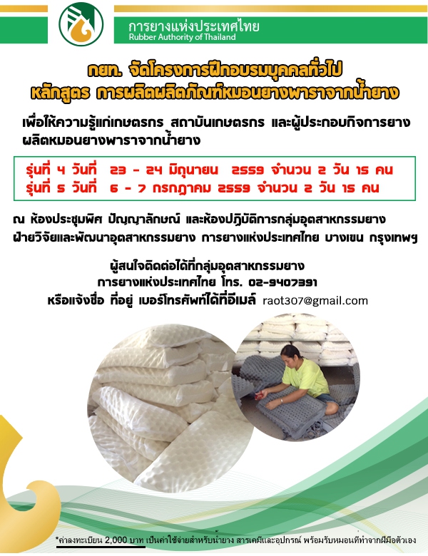 กยท. จัดโครงการฝึกอบรมบุคคลทั่วไป หลักสูตร การผลิตผลิตภัณฑ์หมอนยางพาราจากน้ำยาง