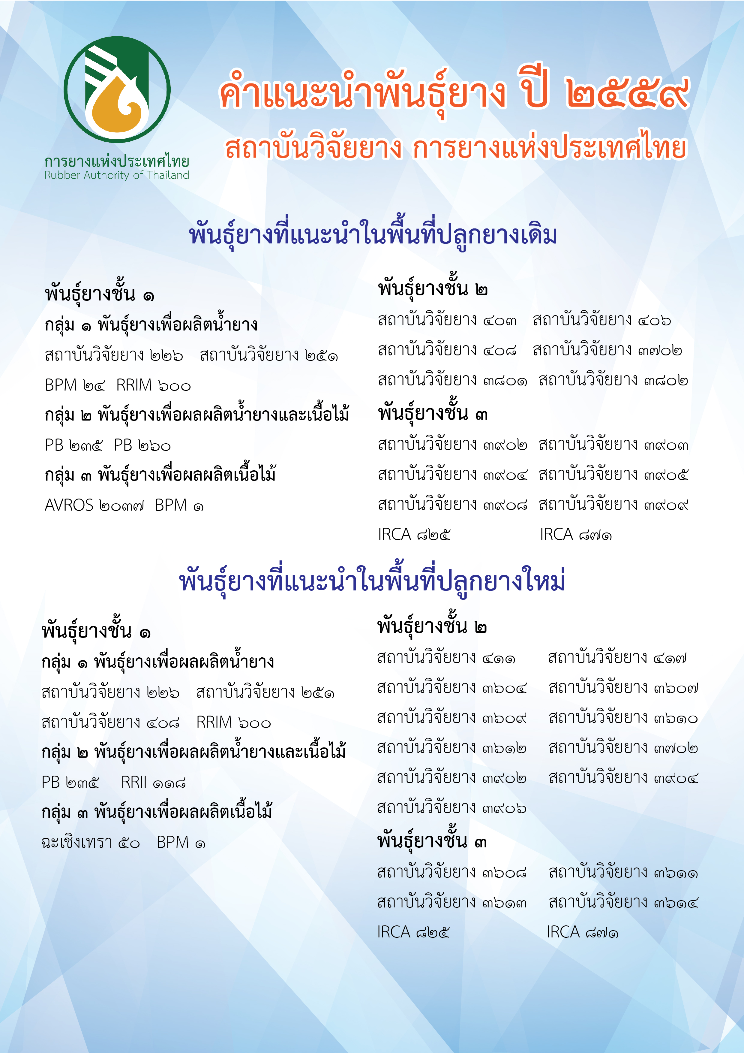 นายเชาว์ ทรงอาวุธ โฆษกการยางแห่งประเทศไทย แถลงว่า ยางพันธุ์ดี นับเป็นปัจจัยสำคัญที่มีผลต่อการปลูกยางและผลผลิตของเกษตรกรชาวสวนยาง การยางแห่งประเทศไทย โดยทุกๆ 4 ปี จะมีการประกาศคำแนะนำพันธุ์ยางใหม่ เพื่อเป็นข้อมูลให้เกษตรกรสามารถเลือกพันธุ์ยางได้หลากหลายมากขึ้น ช่วยลดความเสี่ยงจากการปลูกยางของประเทศที่จะมีพันธุ์ใดพันธุ์หนึ่งมากเกินไป ซึ่งการยางแห่งประเทศไทย โดยสถาบันวิจัยยางได้พิจารณาพันธุ์ยางใหม่ที่ผ่านการวิจัยปรับปรุงพันธุ์ให้เหมาะสมกับสภาพแวดล้อมที่เปลี่ยนแปลงไป ทั้งในส่วนของพื้นที่ปลูกยางเดิมและพื้นที่ปลูกยางใหม่ เพื่อเพิ่มผลผลิตน้ำยางและเนื้อไม้ ยางพันธุ์ดีประจำปี พ.ศ. 2559 แบ่งเป็น ยางพันธุ์ดีชั้น 1 , 2 และ 3 ได้แก่