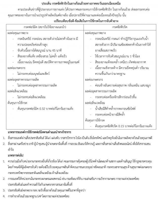 ดร.ธีธัช สุขสะอาด ผู้ว่าการการยางแห่งประเทศไทย กล่าวถึงข้อกังวลกรณียางก้อนถ้วยในภาคอีสานว่า จะไม่โดนแบนแน่นอน เนื่องจากกรดซัลฟิวริกเป็นกรดที่ใช้ในอุตสาหกรรม แต่สามารถนำมาใช้ในเชิงเกษตรได้ ส่วนกรดฟอร์มิก เป็นกรดอินทรีย์ที่หลักวิชาการแนะนำให้ใช้ แต่เนื่องด้วยราคาค่อนข้างสูง และมีขนาดต่างกัน จึงไม่สะดวกต่อการใช้งานในเบื้องต้น ในที่ประชุมกนย. มีแนวทางให้ดำเนินการจัดทำยุทธศาสตร์เป็นขั้นตอน และให้เร่งทำความเข้าใจกับเกษตรกร เพื่อชี้ให้เห็นว่าการใช้กรดทั้งสองตัวจะมีคุณภาพของยางที่ต่างกัน การใช้กรดซัลฟิวริคจะใช้ได้ แต่กรดฟอร์มิกจะได้คุณภาพยางที่ดีเยี่ยม เหมาะสมกับการนำไปแปรรูปใช้ในอุตสาหกรรมยางล้อ ซึ่งกรดซัลฟิวริคก็สามารถนำไปใช้ในอุตสาหกรรมอื่นๆ ได้เช่นกัน จึงไม่ต้องห่วงว่าจะเกิดปัญหาไม่รับซื้อในอนาคต