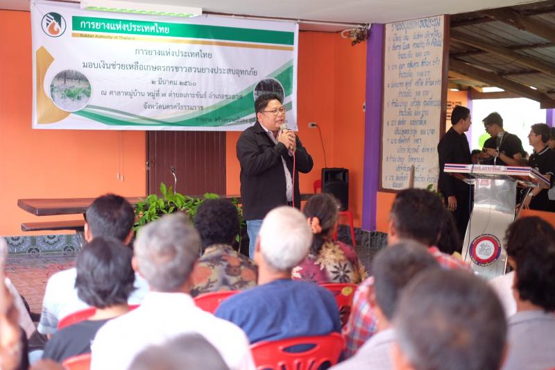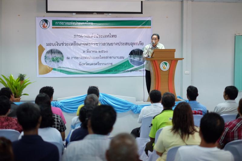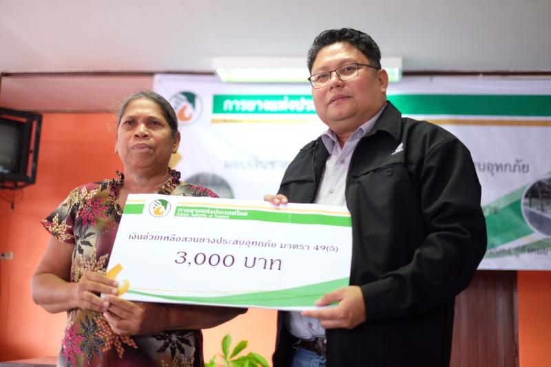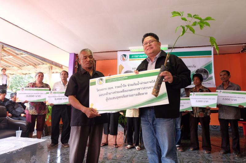 ดร.ธีธัช สุขสะอาด ผู้ว่าการการยางแห่งประเทศไทย กล่าวว่า จากสถานการณ์อุทกภัยในพื้นที่ภาคใต้เมื่อปลายปีที่ผ่านมา เป็นระยะเวลานานต่อเนื่องประมาณ 2 เดือนเศษ ทำให้สวนยางภาคใต้ ซึ่งเป็นพื้นที่ปลูกยางมากที่สุดได้รับความเสียหายเป็นวงกว้างกว่า 7 แสนไร่ เกษตรกรชาวสวนยางได้รับความเดือดร้อนหลายหมื่นครัวเรือน แต่ทั้งนี้ ยางพาราเป็นพืชที่สามารถทนน้ำท่วมขังได้เป็นระยะเวลาหนึ่ง ซึ่งขึ้นอยู่กับอายุของต้นยางด้วย ฉะนั้น ในช่วงที่ผ่านมา กยท.ได้เร่งลงพื้นที่สำรวจสวนยางที่ได้รับความเสียหายหลังจากน้ำลด และเข้าสู่สถานการณ์ปกติในทุกพื้นที่ พบว่า มีพื้นที่สวนยางจมน้ำและสวนยางเกิดความเสียหายไม่สามารถให้ผลผลิตได้ในเบื้องต้นประมาณ 32,655 ไร่ และมีเกษตรกรชาวสวนยางที่ได้รับความเดือดร้อน จำนวน 3,913 ราย ซึ่งเกษตรกรที่ได้รับผลกระทบในครั้งนี้ จะได้รับเงินสวัสดิการ เพื่อบรรเทาความเดือดร้อน รายละ 3,000 บาท จากงบประมาณกองทุนพัฒนายางพารา มาตรา 49 (5) สวัสดิการเกษตรกรชาวสวนยาง เพื่อ ชดเชยรายได้ที่สูญเสีย เป็นการสร้างขวัญและกำลังใจแก่พี่น้องชาวสวนยาง
