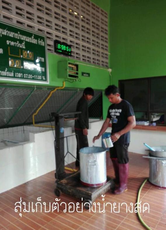3. สุ่มเก็บตัวอย่างน้ำยางสดของสมาชิกแต่ละรายไม่น้อยกว่า 50 มล. เพื่อนำไปหาค่า DRC ที่เป็นตัวแทนของน้ำยางสดที่แท้จริง ด้วยการหาค่า DRC ตามมาตรฐานในห้องปฏิบัติการ