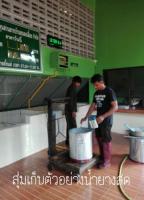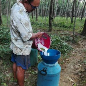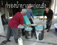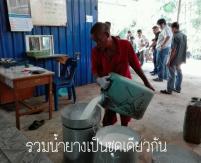 2. ให้รวมน้ำยางสดเป็นชุดเดียวกัน เช่น สมาชิกที่นำน้ำยางมามากกว่า 1 แกลลอน ให้เทน้ำยางในภาชนะรวมโดยผ่านตัวกรองก่อน จากนั้นบันทึกน้ำหนัก