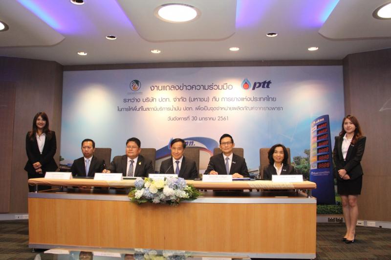 วันนี้ (30 มกราคม 2561) การยางแห่งประเทศไทย ร่วมกับ บริษัท ปตท. จำกัด (มหาชน) ลงนามบันทึกข้อตกลงความร่วมมือในโครงการ "จุดจำหน่ายผลิตภัณฑ์ยางพาราช่วยพัฒนาเกษตรกรไทย” เปิดจุดจำหน่ายสินค้าแปรรูปจากผลิตภัณฑ์ยางพารา ณ จุดบริการสถานีน้ำมัน ปตท. นำร่อง 14 แห่ง ทั่วประเทศ สร้างช่องทางการจำหน่ายสินค้ายางพาราและความสะดวกแก่ประชาชน ยกระดับสินค้ายางพาราสู่มาตรฐานสากล ณ ห้องพลังไทย 1 บริษัท ปตท. จำกัด (มหาชน) เขตจตุจักร กรุงเทพฯ