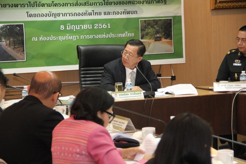 นายเยี่ยม ถาวโรฤทธิ์ รักษาการผู้ว่าการ กยท. แถลงว่า เป็นโอกาสดีที่ทางคณะของผู้บริหารระดับสูงของกระทรวงกลาโหมได้ร่วมประชุมหารือด้านความร่วมมือ เพื่อนำน้ำยางสดจากเกษตรกรชาวสวนยางทั่วประเทศไปใช้ในโครงการส่งเสริมการใช้ยางของหน่วยงานภาครัฐ เมื่อผลักดันราคายางพาราในประเทศให้สูงขึ้น ซึ่งกระทรวงกลาโหมได้รับอนุมัติงบประมาณจากคณะรัฐมนตรี เพื่อจะช่วยเหลือชาวสวนยางที่ประสบกับสถานการณ์ราคายางตกต่ำ จึงมีนโยบายให้หน่วยงานภาครัฐต่างๆ รวมทั้งกระทรวงกลาโหมนำน้ำยางจากชาวสวนยางไปใช้ในการทำกิจกรรมต่างๆ ซึ่งกิจกรรมที่กระทรวงกลาโหมดำเนินการมีอยู่ 2 กิจกรรม คือ การปรับปรุงถนนด้วยการทำเป็นถนนพาราซอยล์ซีเมนต์ และการสร้างสระเก็บน้ำโดยใช้ยางพาราเป็นวัตถุดิบปูพื้นบ่อ