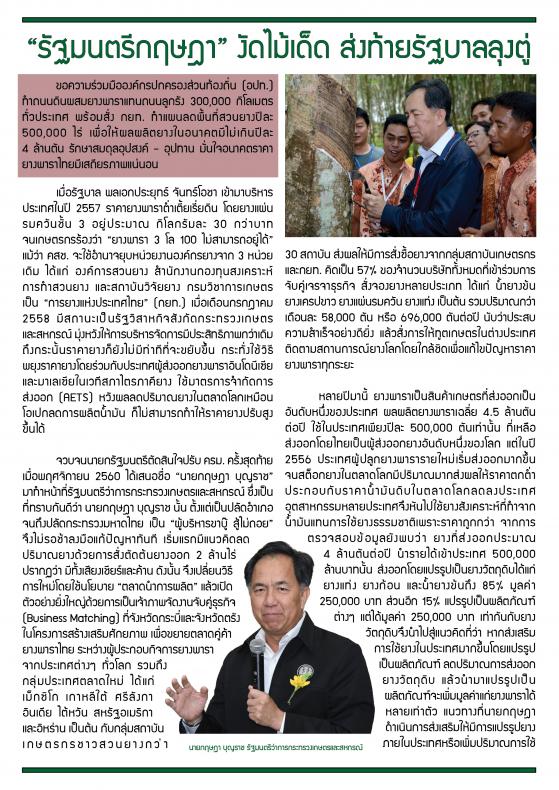 "รัฐมนตรีกฤษฏา งัดไม้เด็ด ส่งท้ายรัฐบาลลุงตู่ ขอความร่วมมือองค์ปกครองท้องถิ่น (อปท.) ทำถนนดินผสมยางพาราแทนถนนลูกรัง 300,000 กิโลเมตรทั่วประเทศ พร้อมสั่ง กยท. ทำแผนลดพื้นที่สวนยางปีละ 500,000 ไร่เพื่อให้ผลผลิตยางในอนาคตมีไม่เกินปีละ 4 ล้านตัน รักษาสมดุลอุปสงค์-อุปทาน มั่นใจ อนาคตราคายางพาราไทยมีเสถียรภาพแน่นอน