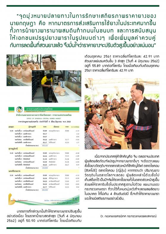 มาตรการที่กล่าวมานั้นทำให้ราคายางพาราปรับสูงขึ้นอย่างต่อเนื่อง โดยราคาน้ำยางสดล่าสุด (วันที่ 4 มิถุนายน 2562) อยู่ที่ 50.90 บาทต่อกิโลกรัม โดยเมื่อเทียบกับเดือนตุลาคม 2561 ราคาเฉลี่ยกิโลกรัมละ 42.91 บาท ส่วนยางแผ่นรมควันชั้น 3 ล่าสุด (วันที่ 4 มิถุนายน 2562) อยู่ที่ 55.89 บาทต่อกิโลกรัม โดยเมื่อเทียบกับเดือนตุลาคม 2561 ราคาเฉลี่ยกิโลกรัมละ 42.91 บาท