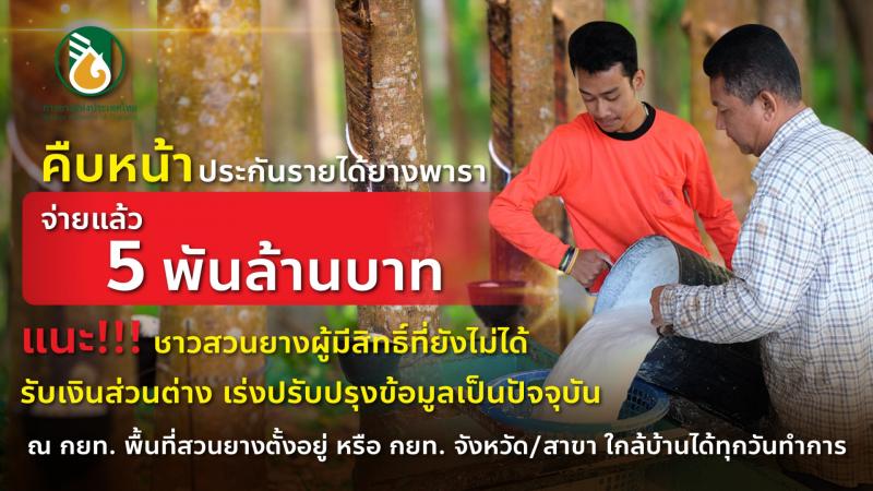 การยางแห่งประเทศไทย (กยท.) เผยโครงการประกันรายได้เกษตรกรชาวสวนยาง ระยะ 2 คืบหน้าจ่ายเงินแล้วร่วม 5,000 ล้านบาท ขอชาวสวนยางที่มีสิทธิ์ในโครงการแต่ยังไม่ได้รับเงินเร่งติดต่อ กยท. เพื่อปรับปรุงข้อมูลในระบบ