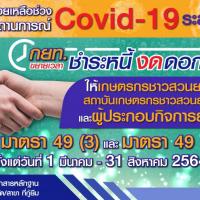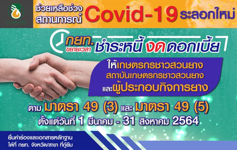 นายสุขทัศน์ ต่างวิริยกุล รองผู้ว่าการด้านปฏิบัติการ เปิดเผยว่า จากสถานการณ์การแพร่ระบาดของไวรัสโคโรน่า 2019 (COVID-19) ส่งผลกระทบต่อภาคการเกษตร การดำเนินธุรกิจและประกอบอาชีพของเกษตรกรชาวสวนยาง สถาบันเกษตรกร ไปจนถึงผู้ประกอบกิจการแปรรูปยาง ดังนั้น การยางแห่งประเทศไทย (กยท.) จึงมีแนวทางช่วยเหลือด้านหนี้สินแก่ผู้ที่กู้ยืมเงินกับ กยท. ผ่านกองทุนพัฒนายางพารา มาตรา 49(3) สำหรับเป็นค่าใช้จ่ายในการสนับสนุน ส่งเสริม และให้ความช่วยเหลือเกษตรกรชาวสวนยาง สถาบันเกษตรกรชาวสวนยาง ผู้ประกอบกิจการยาง จำนวน 1,468 ราย และผู้ที่กู้ยืมเงินผ่านกองทุนพัฒนายางพารา มาตรา 49(5) เงินกู้ยืมเพื่อบรรเทาความเดือดร้อนของเกษตรกรชาวสวนยาง จำนวน 5,585 ราย โดยขยายเวลาของสัญญาเงินกู้ยืม หรือผ่อนผันการชำระหนี้ในแต่ละงวดตามที่กำหนดไว้ ให้สามารถผ่อนผันการชำระหนี้ได้เป็นเวลา 6 เดือน คือ ตั้งแต่วันที่ 1 มีนาคม ไปจนถึง 31 สิงหาคม 2564 โดยงดการคิดดอกเบี้ย ค่าปรับ ในการขยายระยะเวลาสัญญาเงินกู้ในแต่ละงวด