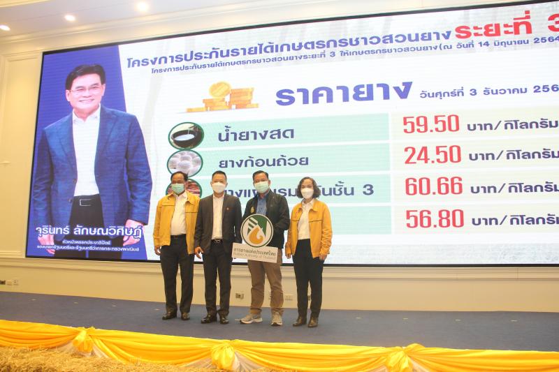 นายณกรณ์ ตรรกวิรพัท ผู้ว่าการการยางแห่งประเทศไทย กล่าวว่า ตามมติที่ประชุมคณะรัฐมนตรี เมื่อวันที่ 30 พฤศจิกายน 2564 เห็นชอบให้ดำเนินการโครงการประกันรายได้เกษตรกรชาวสวนยาง ระยะที่ 3 วงเงินรวมงบประมาณเพื่อจ่ายส่วนต่างประกันรายได้ยาง ทั้ง 3 ชนิด ทั้งสิ้นประมาณ 10,065 ล้านบาท สำหรับเกษตรกรชาวสวนยางที่ขึ้นทะเบียนกับการยางแห่งประเทศไทย (กยท.) ซึ่งจะได้รับการชดเชยส่วนต่างตามรูปแบบผลผลิตที่เกษตรกรขาย โดยกำหนดราคาประกันรายได้ 3 ชนิด ได้แก่ ยางแผ่นดิบคุณภาพดี