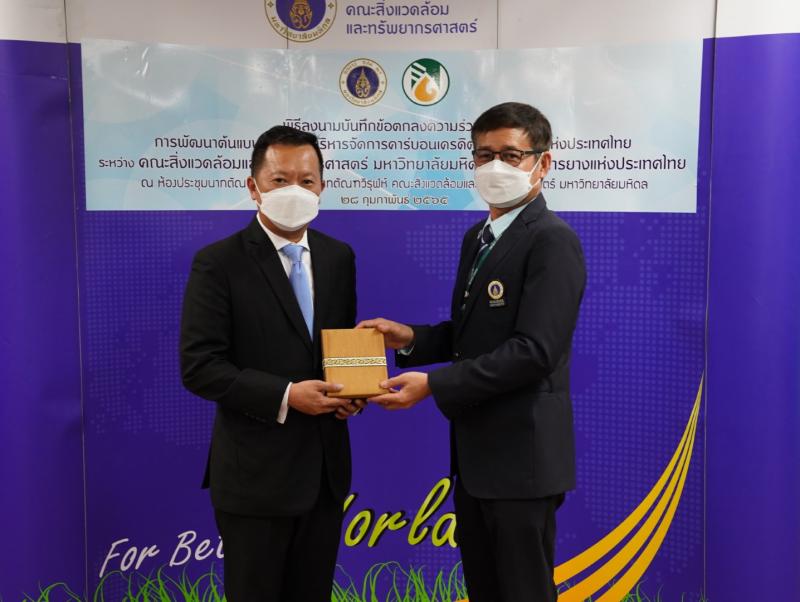 วันนี้ (28 กุมภาพันธ์ 2565) มหาวิทยาลัยมหิดล โดยคณะสิ่งแวดล้อมและทรัพยากรศาสตร์ร่วมกับการยางแห่งประเทศไทย (กยท.) ทำบันทึกข้อตกลงเดินหน้าพัฒนาต้นแบบโครงการบริหารจัดการคาร์บอนเครดิตในสวนยาง มุ่งเป้าลดก๊าซเรือนกระจก รักษาสมดุลสิ่งแวดล้อมในภาคการเกษตร ณ ห้องประชุมนาทตัณฑวิรุฬห์ อาคารนาทตัณฑวิรุฬห์ คณะสิ่งแวดล้อมและทรัพยากรศาสตร์ มหาวิทยาลัยมหิดล