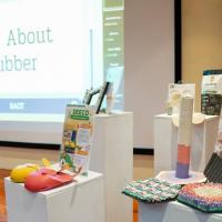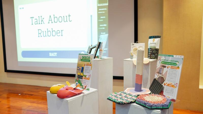 นายณกรณ์ ตรรกวิรพัท กล่าวถึง โครงการ Natural Rubber Startup Acceleration Program: Batch 2 by RAOT and PSU ที่ กยท. ร่วมกับ มหาวิทยาลัยสงขลานครินทร์ นำแนวคิดบวกกับนวัตกรรม และเงินทุน ทำให้เกิดธุรกิจใหม่ พัฒนาผลิตภัณฑ์การวิจัยต่างๆ ให้เห็นเป็นรูปธรรม เพื่อการเข้าถึงแหล่งเงินทุน การเจรจาซื้อขาย การค้า ทรัพย์สินทางปัญญา เพิ่มมูลค่าสินค้า โดยมีแนวทางการคิดค้นนวัตกรรม ผลิตภัณฑ์เพื่อสัตว์เลี้ยง ปศุสัตว์ สิ่งแวดล้อม ลดขยะโดยการนำกลับมาใช้ใหม่ ลดการใช้พลังงาน เพื่อสิ่งแวดล้อม ซึ่งมีผลิตภัณฑ์ที่ได้รับการเลือก ซึ่งแบ่งออกเป็น 3 กลุ่ม คือ 1. กลุ่มนวัตกรรมเพื่อสัตว์เลี้ยงและปศุสัตว์และการเกษตร เช่น รองเท้าโคจากยางพารา เพื่อลดปัญหาด้านสุขภาพของโค ลดอาการบาดเจ็บได้ ที่ลับเล็บแมวจากวัสดุ TPNR และไม้ยางพารา ผลิตจากวัสดุมีความทนทานมากขึ้นจากเดิมที่มักจะใช้กระดาษลูกฟูก พร้อมทั้งมีการเพิ่มกลิ่นจาก Catnip หรือกัญชาแมว จะทำให้แมวรู้สึกผ่อนคลาย และหนังเทียมวัสดุทางการเกษตรและยางพารา สร้างมูลค่าของสินค้าเกษตร โดยใช้เทคโนโลยีทำให้เกิดวัสดุใหม่ 2. กลุ่มนวัตกรรมเพื่อลดการใช้พลังงาน ลดการปล่อยก๊าซพิษ เพื่อสิ่งแวดล้อม เช่น ทุ่นลอยน้ำ ที่สามารถใช้งานได้หลากหลาย ออกแบบให้ต่อเหมือนจิ๊กซอว์ โดยสามารถวางแผงโซล่าเซลล์ลอยน้ำได้ หรือใช้เป็นกระชังเลี้ยงสัตว์ แพลอยน้ำ บ้านน็อคดาวน์ได้ ทุ่นกักขยะและทุ่นกักน้ำมันยางพารา นำยางพารามาเป็นวัตถุดิบเพื่อผลิตเป็นทุ่นลอยน้ำ ใช้กักขยะและกักน้ำมันทดแทนโฟม ซึ่งมีอายุการใช้งานที่ยาวนานกว่าโฟมธรรมดา ทดทานต่อน้ำมันและไม่ปลดปล่อยสารที่เป็นพิษต่อแหล่งน้ำ ปุ๋ยอินทรีย์เคลือบยางพารา ในรูปแบบอัดเม็ดที่เคลือบผิวด้วยกาวยางพาราสูตรพิเศษ ช่วยควบคุมการปลดปล่อยปุ๋ยให้ออกมาช้าๆร่วมกับการปลดปล่อยเชื้อจุลินทรีย์ไตรโคเดอร์มา ทำให้พืชแข็งแรง พร้อมทั้งลดมลพิษในอากาศ ปุ๋ยมูลจิ้งหรีดเคลือบยางพารา เป็นผลิตภัณฑ์มีส่วนประกอบของมูลจิ้งหรีด 70% น้ำยาง 30% เป็นการนำของเหลือทิ้งจากกระบวนการเลี้ยงสัตว์ ซึ่งการเคลือบด้วยยางธรรมชาติจะทำให้ปุ๋ยละลายช้าขึ้นเป็นผลดีต่อการเจริญเติบโตของพืช 3. กลุ่มนวัตกรรม Upcycle เพื่อลดขยะและการนำกลับมาใช้ใหม่ โดยการทำหวายเทียมยางธรรมชาติเทอร์โมพลาสติก
