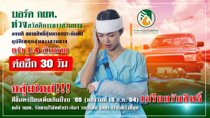 บอร์ด กยท. ห่วงสวัสดิการชาวสวนยาง ลงมติ ขยายสิทธิ์คุ้มครองประกันภัยอุบัติเหตุกลุ่มชาวสวนยางกว่า 1.42 ล้านราย ต่ออีก 30 วัน สำหรับกลุ่มใหม่ที่ขึ้นทะเบียนเพิ่มเติมหลัง 15 ก.ค. 64 เตรียมรับสิทธิ์ เมื่อ กยท. จัดหาบริษัททำประกันภัยอุบัติเหตุกลุ่มรอบใหม่ โดยเร็วที่สุด