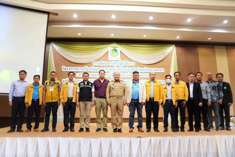 นายขจรจักษณ์ นวลพรหมสกุล รองผู้ว่าการด้านบริหาร กล่าวว่า กยท. ซึ่งเป็นองค์กรที่ดูแลและให้การสนับสนุนกลุ่มเกษตรกรชาวสวนยางที่ผลิตน้ำยาง ตระหนักและห่วงใยผลกระทบจากโรคใบร่วงชนิดใหม่ในยางพารา ซึ่งส่งผลต่อรายได้และคุณภาพความเป็นอยู่ของชาวสวนยาง ด้วยความตั้งใจในการขยายผลไปสู่การปฏิบัติในเกษตรกรกลุ่มเป้าหมายให้สามารถรายงานข้อมูลโรคใบร่วงชนิดใหม่ในยางพารามายังส่วนกลางได้อย่างถูกต้อง เพื่อการบริหารจัดการโรคใบร่วงให้ได้อย่างมีประสิทธิภาพ กยท. จึงจัดงานสัมมนาเชิงปฏิบัติการ "โครงการการป้องกันและควบคุมโรคใบร่วงชนิดใหม่ในยางพารา : การขยายผลสู่การปฏิบัติในแปลงเกษตรกร” เพื่อให้ความรู้ความเข้าใจเกี่ยวกับโรคใบร่วงชนิดใหม่ในยางพาราให้แก่เกษตรกรชาวสวนยาง และผู้ที่เกี่ยวข้องในพื้นที่ภาคกลางและภาคตะวันออก จำนวน 250 คน เพื่อนำความรู้ที่ได้จากการจัดสัมมนาไปใช้ป้องกันและควบคุมโรคในสวนยาง โดยตั้งเป้าขยายผลไปสู่การปฏิบัติของเกษตรกรกลุ่มเป้าหมาย 6 จังหวัด ประกอบด้วย ระยอง จันทบุรี ตราด ฉะเชิงเทรา อุทัยธานี กาญจนบุรี รวมพื้นที่สวนยางไม่น้อยกว่า 3,000 ไร่