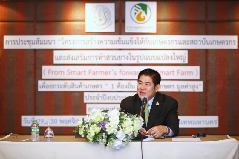นายณกรณ์ ตรรกวิรพัท ผู้ว่าการ กยท. กล่าวว่า การยางแห่งประเทศไทย (กยท.) มุ่งเน้นการยกระดับสินค้าเกษตร "1 ท้องถิ่น 1 สินค้าเกษตร มูลค่าสูง” ตามนโยบายของท่าน รมว.เกษตรฯ โดย กำหนดเป้าหมายนำร่อง จำนวน 120 แห่งทั่วประเทศ ผ่านโครงการส่งเสริมการทำสวนยางในรูปแบบแปลงใหญ่ (Smart Farm) ภายใต้แผนสร้างความเข้มแข็งให้สอดคล้องกับการพัฒนายางพาราทั้งระบบ ประกอบด้วยการอบรมพัฒนาความรู้ด้านยางพาราครบวงจร ได้แก่ การลดต้นทุนการผลิตและเพิ่มผลผลิต ได้มากถึงร้อยละ 2.5 ต่อปี การพัฒนาคุณภาพให้ได้มาตรฐาน การบริหารจัดการ และการจัดการด้านการตลาด ส่งเสริมการใช้นวัตกรรมเทคโนโลยีเพื่อก้าวไปสู่ Smart Farm โดยปัจจุบันมีพื้นที่สวนยางรูปแบบแปลงใหญ่จำนวน 491,135 ไร่ และกำหนดเป้าหมายปี 2567 เพิ่มขึ้นกว่า 40,000 ไร่ โครงการสร้างความเข้มแข็งให้กับเกษตรกรและสถาบันเกษตรกร (Smart Farmer) โดยการอบรมพัฒนาความรู้ด้านยางพารา ส่งเสริมการประกอบอาชีพเกษตรกรชาวสวนยาง เพื่อก้าวไปสู่ Smart Farmer ได้ ซึ่งปัจจุบันมีเกษตรกรที่ได้รับการพัฒนาจำนวน 29,029 ราย และวางเป้าหมายการพัฒนาในปีนี้จำนวน 5,750 ราย การสัมมนาครั้งนี้ จึงเป็นโอกาสดีที่พนักงาน กยท. จะได้รับความรู้ ความเข้าใจในงานส่งเสริมเกษตรกรและสถาบันเกษตรกร ซึ่งเป็นไปตามนโยบายของรัฐบาล กระทรวงเกษตรฯ โดยสามารถนำความรู้ที่ได้ ไปถ่ายทอดให้ผู้ปฏิบัติงานในส่วนงานและหน่วยงาน ตลอดจนเกษตรกรและสถาบันเกษตรกรชาวสวนยางที่ดูแลและรับผิดชอบอยู่ได้อย่างมีประสิทธิภาพ