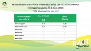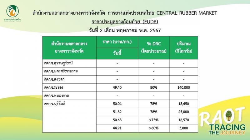 นายณกรณ์ ตรรกวิรพัท ผู้ว่าการการยางแห่งประเทศไทย กล่าวว่า การประมูลซื้อขายยางตรวจสอบย้อนกลับผลผลิตได้ในวันนี้ (2 พ.ค. 67) มีปริมาณยางที่รวบรวมจากสถาบันเกษตรกรชาวสวนยาง ซึ่งตรงตามที่กฎระเบียบ EUDR กำหนด เข้าขายผ่านตลาดกลางยางพาราของ กยท. โดยมีผู้ซื้อเข้าประมูลผ่านระบบเป็นจำนวนมาก ทั้งนี้ ผลการประมูลราคายางแผ่นรมควันชั้น 3 ปิดราคาสูงสุดที่ 85.77 บาท/กก. และยางก้อนถ้วย (DRC 78%) ปิดราคาสูงสุดที่ 51.32 บาท/กก. คิดเป็นมูลค่ารวมกว่า 16.8 ล้านบาท เบื้องต้น กยท. กำหนดจัดการประมูลซื้อขายยาง EUDR สัปดาห์ละ 1 ครั้ง คือ ทุกวันพฤหัสบดี โดยกำหนดช่วงประมูลตั้งแต่ เวลา 13.00 - 14.00 น. ซึ่งจะประกาศสรุปผลราคาประมูลในแต่ละครั้งบนหน้าเว็บไซต์ของ กยท. (https://www.raot.co.th)