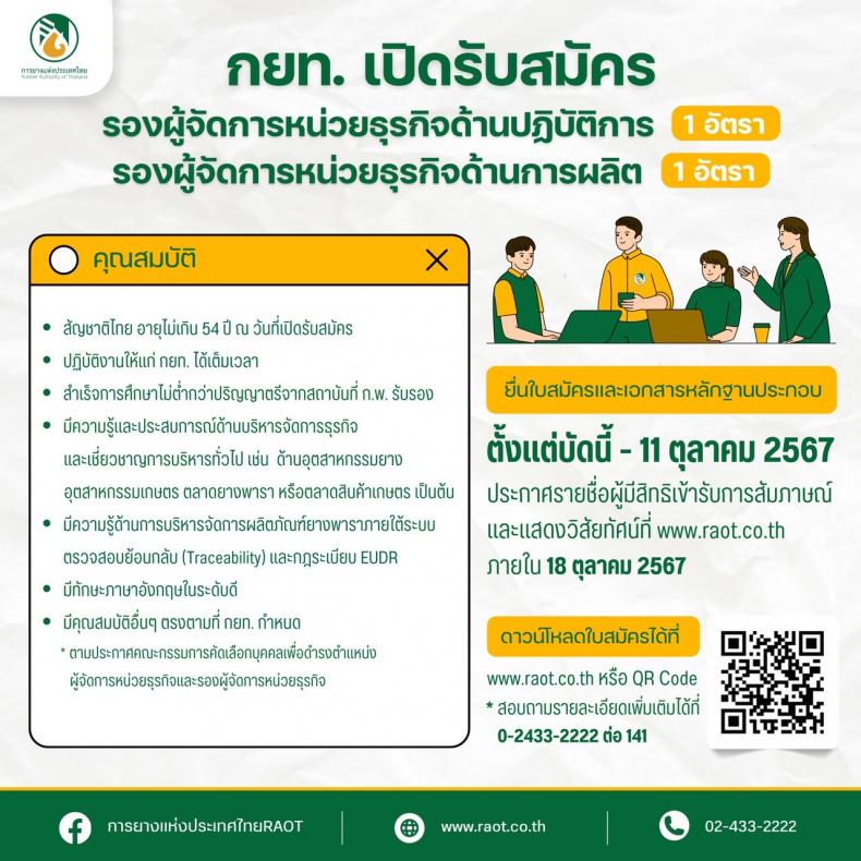 กยท. เป็นรัฐวิสาหกิจในสังกัดกระทรวงเกษตรและสหกรณ์เปิดรับสมัครบุคคลเพื่อดำรงตำแหน่งรองผู้จัดการหน่วยธุรกิจ (ด้านปฏิบัติการ) และรองผู้จัดการหน่วยธุรกิจ (ด้านการผลิต) โดยกำหนดคุณสมบัติทั่วไป เป็นผู้มีสัญชาติไทย มีอายุไม่เกิน 54 ปีบริบูรณ์ (ณ วันที่ปิดรับสมัคร) สามารถปฏิบัติงานให้แก่ กยท. ได้เต็มเวลา และมีคุณสมบัติอื่นๆ ตามที่ กยท. กำหนด ทั้งนี้ ผู้สมัครจะต้องสำเร็จการศึกษาไม่ต่ำกว่าปริญญาตรีหรือเทียบเท่า มีทักษะภาษาอังกฤษ รวมถึงมีความรู้ความสามารถและประสบการณ์ทำงานในด้านธุรกิจเป็นอย่างดี มีความเชี่ยวชาญการบริหารทั่วไป ด้านธุรกิจ อุตสาหกรรมเกษตร ตลาดยางพารา ตลาดสินค้าการเกษตร สามารถวิเคราะห์ข้อตกลงทางการค้า การเจรจา การส่งเสริม การพัฒนาธุรกิจ แก้ไขอุปสรรคทางการค้า มีความรู้ด้านการบริหารจัดการผลิตภัณฑ์ยางพาราภายใต้ระบบการตรวจสอบย้อนกลับ (Traceability) การบริหารจัดการ การตลาด การผลิตและแปรรูปผลิตภัณฑ์ยาง ตามกฎระเบียบของสหภาพยุโรป (EU-Deforestation Regulation: EUDR)