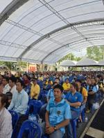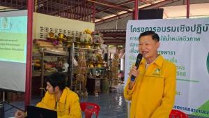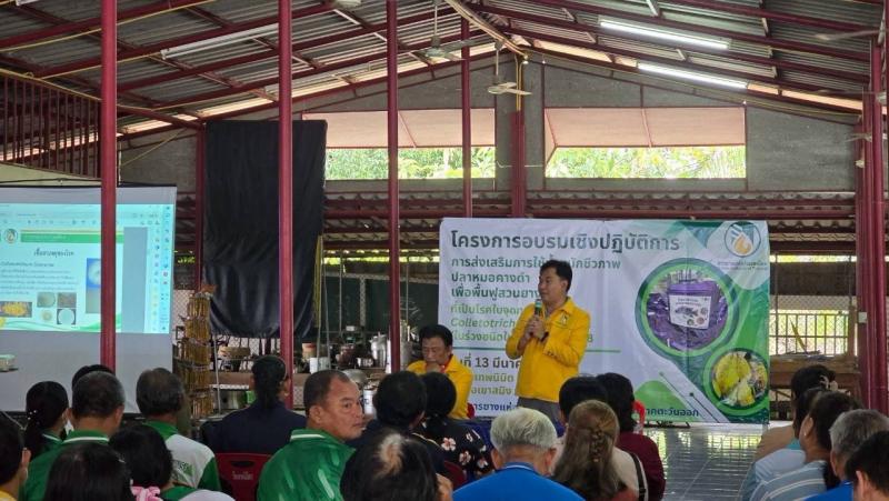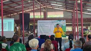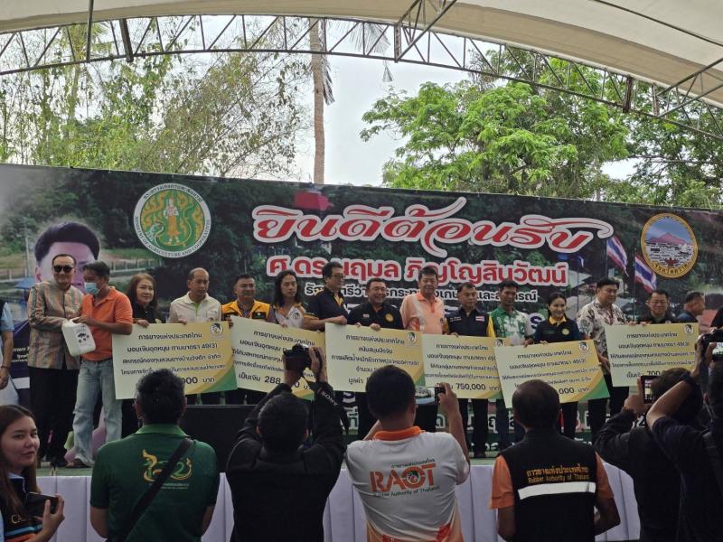 นายโกศล บุญคง รองผู้ว่าการด้านบริหาร กล่าวว่า กยท. ได้ให้ความสำคัญ และกำหนดแนวทางขับเคลื่อนการดำเนินมาตรการต่างๆ เพื่อป้องและช่วยเหลือเยียวยาเกษตรกร ลดการแพร่ระบาดและลดความรุนแรงของโรคใบร่วง ให้เกษตรกรชาวสวนยางสามารถยืนอยู่ได้กับอาชีพการทำสวนยาง โดย กยท. ได้มุ่งประชาสัมพันธ์ สร้างการรับรู้เกี่ยวกับโรคฯ แก่เกษตรกรอย่างต่อเนื่อง การจัดหาสารเคมีที่ทดสอบแล้วมีประสิทธิภาพในการป้องกันกำจัดเชื้อ การบำรุงรักษาต้นยางและการลดเชื้อในสวนยาง ผ่านโครงการสนับสนุนปัจจัยการผลิต ปุ๋ย ชีวภัณฑ์ รวมไปถึงการพัฒนาพันธุ์ยางต้านทานโรคฯ โดย กยท. ได้เริ่มบูรณการประสานความร่วมมือกับภาคเอกชนและเกษตรกร ทดสอบและจัดหาปุ๋ย ชีวภัณฑ์ และสารอื่นๆ เพื่อให้ได้แนวทางการแก้ปัญหา การระบาดของโรคฯ ได้อย่างตรงจุดและมีประสิทธิภาพสูงสุด ทั้งนี้ การดำเนินโครงการอบรมเชิงปฏิบัติการฯ เป็นอีกหนึ่งวิธีที่ช่วยสร้างการรับรู้และความเข้าใจที่ถูกต้องให้แก่เกษตรกรสามารถสำรวจต้นยางและประเมิน ความเสี่ยงที่อาจจะเกิดโรคระบาดในสวนยางพาราของตนเอง ตลอดจนเกษตรกรมีความรู้ที่จะป้องกันและแก้ปัญหาลดความรุนแรงจากโรคใบร่วงได้ นายโกศล กล่าวเพิ่มเติมว่า การจัดอบรมเชิงปฏิบัติการฯ ในวันนี้ กยท. ได้สนับสนุนการใช้น้ำหมักชีวภาพปลาหมอคางดำ มอบแก่พี่น้องเกษตรกร จำนวน 500 ลิตร ซึ่งน้ำหมักชีวภาพปลาหมอคางดำถือเป็นปัจจัยในการบำรุงพืชที่มีประสิทธิภาพสูง เนื่องจากอุดมไปด้วยธาตุอาหารหลัก ธาตุอาหารรอง และจุลธาตุที่มีส่วนช่วย ในการเจริญเติบโตของต้นยางได้ เหมาะกับการนำไปใช้ในสวนยางและพืชผลทางการเกษตรชนิดอื่นๆ เช่น ทุเรียน ลำไย เป็นต้น นอกจากเกษตรกรจะได้รับการสนับสนุนน้ำหมักแล้ว ยังได้รับความรู้เกี่ยวกับวิธีการใช้น้ำหมักฯ อย่างถูกต้อง รวมถึงมีโอกาสได้แลกเปลี่ยนความคิดเห็น และหารือแนวทางแก้ไขปัญหาอื่นๆ ในสวนยางกับหน่วยงานที่ดูแลรับผิดชอบโดยตรง อันจะเป็นประโยชน์ที่เกษตรกรชาวสวนยางสามารถนำไปปรับใช้ และถ่ายทอดความรู้ให้กับเกษตรกรรายอื่นด้วย