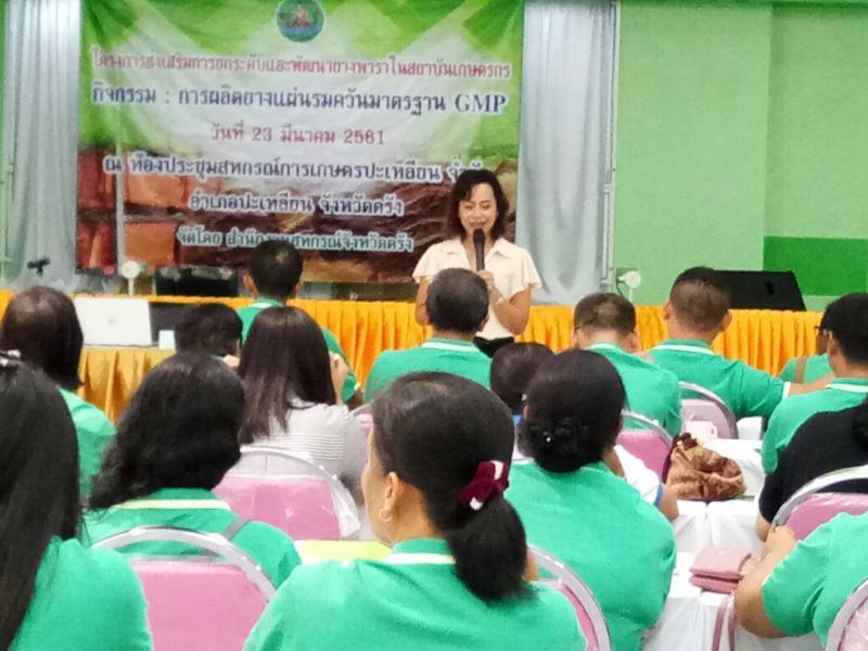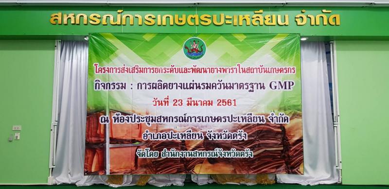 วันที่ 23 มีนาคม 2561 สำนักงานสหกรณ์จังหวัดตรัง ได้จัดโครงการส่งเสริมการยกระดับและพัฒนายางพาราในสถาบันเกษตรกร ตามกิจกรรม การผลิตยางแผ่นรมควันมาตรฐาน GMP ณ ห้องประชุมสหกรณ์ปะเหลียนจำกัด จ. ตรัง การจัดอบรมในครั้งนี้ได้รับเกียรติจากนางปรีดิ์เปรม ทัศนกุล ผู้อำนวยการศูนย์บริการทดสอบรับรองภาคใต้ เป็นวิทยากร โดยมีนางอุไรรัตน์ พรหมหนู ผู้อำนวยการกลุ่มส่งเสริมและพัฒนาธุรกิจสหกรณ์ สำนักงานสหกรณ์จังหวัดตรัง ทำหน้าที่เป็นประธานในพิธีเปิด มีตัวแทนจากสกย. ในเขตอ. ปะเหลียน รวม 70 คน โดยมีวัตถุประสงค์เพื่อให้สมาชิกของสกย.สามารถนำความรู้ไปพัฒนาต่อยอดปรับปรุงโรงรมควันที่รับผิดชอบให้เป็นไปตามมาตรฐาน ซึ่งหลังจากที่ได้บรรยายเสร็จในภาคบ่าย คณะ GMP ลงพื้นที่ตรียมความพร้อมให้กับสกย.ป่ากอ จำกัด อ.ปะเหลียน จ. ตรัง ในการนำร่องจัดทำมาตรฐาน GMP และสหกรณ์การเกษตรทุ่งยาว จำกัด ในการเตรียมความพร้อมจุดรวบรวมน้ำยางสดเข้าสู่มาตรฐาน GMP ด้วยเช่นกัน