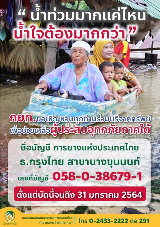 "กยท. ขอเชิญชวนร่วมช่วยเหลือเกษตรกรชาวสวนยางที่ประสบอุทกภัยภาคใต้ โดยร่วมบริจาคทรัพย์ผ่านบัญชี การยางแห่งประเทศไทย เลขที่บัญชี 058-0-38679-1 ธนาคารกรุงไทย สาขาบางขุนนนท์ ได้ตั้งแต่บัดนี้ ถึง 31 มกราคม 2564 สอบถามเพิ่มเติมได้ที่ การยางแห่งประเทศไทย (กองกลาง) โทร 0-2433-2222 ต่อ 291 ผู้ว่าการ กล่าวทิ้งท้าย |