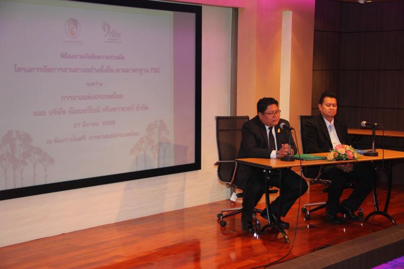 ดร.ธีธัช สุขสะอาด ผู้ว่าการการยางแห่งประเทศไทย เผยว่า การยางแห่งประเทศไทย (กยท.) ได้มีการสนับสนุนการทำสวนยางตามมาตรฐาน FSC (Forest Stewardship Council) มาอย่างต่อเนื่อง ภายใต้โครงการยางพาราประชารัฐ เกิดจากความร่วมมือระหว่าง กยท. ตัวแทนภาครัฐ และตัวแทนภาคเอกชน พร้อมทั้ง การมีส่วนร่วมของเกษตรกรชาวสวนยางทั่วประเทศ ล่าสุด กยท. และบริษัท นัมเบอร์ไนน์ กรีนพาวเวอร์ จำกัด ร่วมกันลงนามบันทึกข้อตกลงความร่วมมือ (MOU) เพื่อพัฒนา และสร้างเกณฑ์การจัดสวนยางอย่างยั่งยืน ตามมาตรฐานในระดับสากล หวังเพิ่มมูลค่าไม้ยางพาราให้กับเกษตรกรชาวสวนยางทั่วประเทศ ด้วยการใช้ไม้ยางพาราและผลิตภัณฑ์จากไม้ยางพาราในการจำหน่ายในประเทศและต่างประเทศ รวมถึงพัฒนาธุรกิจอุตสาหกรรมไม้ยางพารา และผลิตภัณฑ์จากไม้ยางพาราอย่างครบวงจร โดยคำนึงถึงการอนุรักษ์ฟื้นฟูทรัพยากรธรรมชาติ และสิ่งแวดล้อม