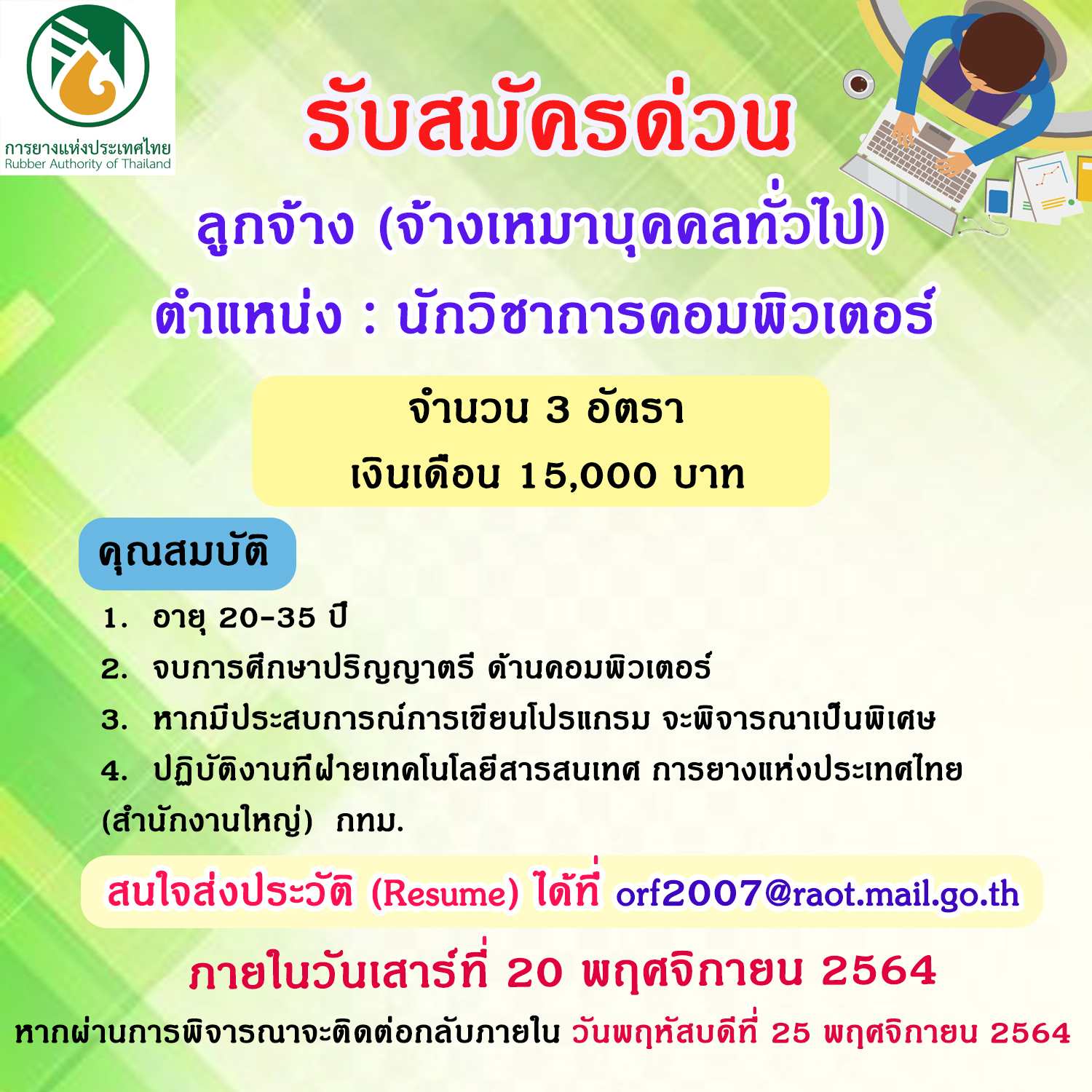 ประกาศ รับสมัคร ลูกจ้าง ตำแหน่งนักวิชาการคอมพิวเตอร์ จำนวน 3 อัตรา