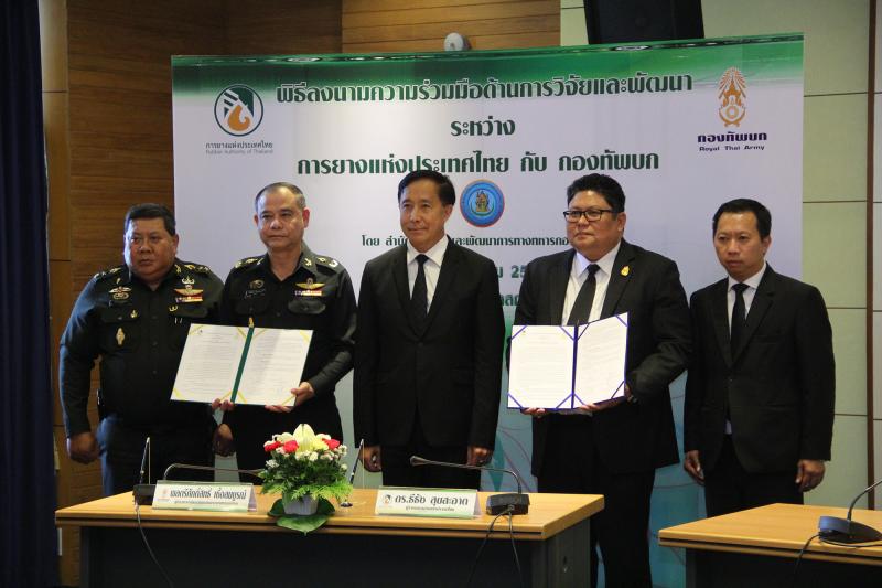 การยางแห่งประเทศไทย ร่วมผนึกกำลังกองทัพบก ลงนามบันทึกความเข้าใจว่าด้วยความร่วมมือด้านการวิจัยและพัฒนา ผลักดันนโยบายส่งเสริมการใช้ยางในประเทศ ต่อยอดงานวิจัย นำนวัตกรรมการแปรรูปผลิตภัณฑ์ยางด้านยุทโธปกรณ์