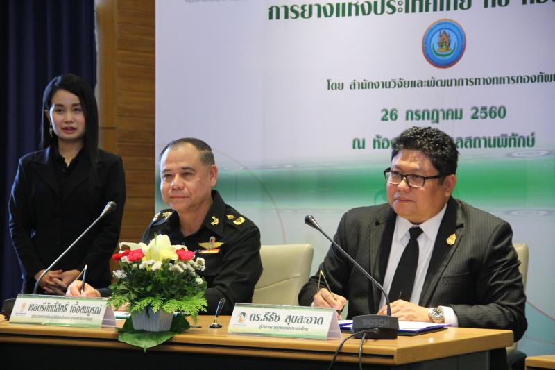 ดร.ธีธัช สุขสะอาด ผู้ว่าการการยางแห่งประเทศไทย เผยว่า การยางแห่งประเทศไทยและกองทัพบก ตระหนักถึงความสำคัญในนโยบายด้านยางพาราของรัฐบาลที่เน้นดำเนินการแปรรูปยางพาราเพื่อเพิ่มมูลค่า และสนับสนุนการใช้ยางภายในประเทศ รวมทั้ง นโยบายด้านความมั่นคงและการป้องกันประเทศ ซึ่งทุกภาคส่วนต้องร่วมมือกันขับเคลื่อนให้เกิดเป็นรูปธรรมตามนโยบายที่ได้กำหนดเป้าหมายไว้ ทั้งนี้ การยางแห่งประเทศไทยซึ่งเป็นองค์กรกลางรับผิดชอบดูแลการบริหารจัดการยางพาราของประเทศไทยทั้งระบบอย่างครบวงจร ร่วมกับสำนักงานวิจัยและพัฒนาการทางทหารกองทัพบก ซึ่งเป็นหน่วยที่รับผิดชอบงานวิจัย และพัฒนาการทางทหารกองทัพบก ที่เชี่ยวชาญในการทำวิจัยและพัฒนาด้านเทคโนโลยีความมั่นคง ได้มีความเห็นพ้องต้องกันที่จะประสานความร่วมมือ และนำศักยภาพของแต่ละหน่วยงานมาร่วมกันเสริมสร้างความมั่นคงและศักยภาพในการป้องกันประเทศผ่านการนำผลผลิตยางพารามาวิจัยและพัฒนา เพื่อนำไปสู่การแปรรูปเป็นนวัตกรรมและเทคโนโลยีใหม่ๆ ที่มีมาตรฐานและประสิทธิภาพในการนำไปใช้ได้จริงในอนาคต