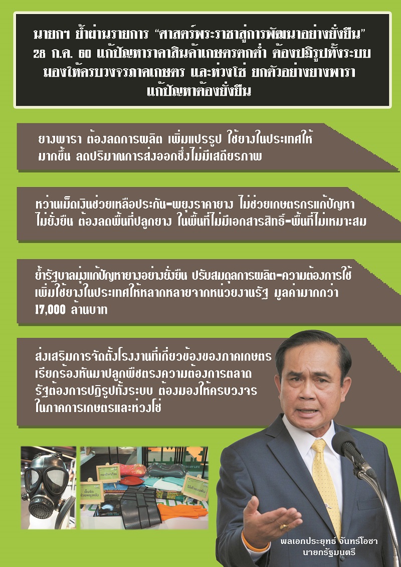 พลเอกประยุทธ์ จันทร์โอชา นายกรัฐมนตรี ออกอากาศรายการ "ศาสตร์พระราชาสู่การพัฒนาอย่างยั่งยืน ทางโทรทัศน์รวมการเฉพาะกิจ เมื่อวันที่ 28 กรกฎาคม 2560 ใจความสำคัญตอนหนึ่งกล่าวถึงการแก้ปัญหาราคาสินค้าเกษตรไทยที่ตกต่ำ ต้องศึกษาปัจจัยของปัญหารอบด้าน เน้นปฏิรูปทั้งระบบ มองให้ครบวงจรภาคเกษตรและห่วงโซ่ ยกตัวอย่างการแก้ไขปัญหายางพารา ดังนี้