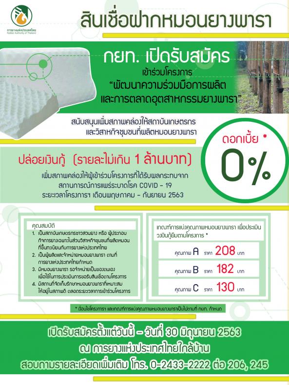 นางณพรัตน์ วิชิตชลชัย รองผู้ว่าการการยางแห่งประเทศไทยด้านอุตสาหกรรมยางและการผลิตยาง เปิดเผยว่า จากสถานการณ์การแพร่ระบาดของโรคไวรัสโคโรน่า 2019 (COVID-19) ส่งผลให้ภาคการผลิต การตลาด และการส่งออกหยุดชะงักไป รวมถึงกลุ่มผู้ผลิตหมอนยางพารา ซึ่งได้รับผลกระทบเนื่องจากประเทศจีนซึ่งเป็นลูกค้ารายสำคัญชะลอการท่องเที่ยวในประเทศไทยและการสั่งซื้อหมอนยางพารา จึงจัดทำโครงการพัฒนาความร่วมมือการผลิตและการตลาดอุตสาหกรรมยางพารา (สินเชื่อฝากหมอนยางพารา) ให้กับสถาบันเกษตรกรชาวสวนยาง วิสาหกิจชุมชนผู้ผลิตหมอนยางพาราที่ขึ้นทะเบียนกับ กยท. เพื่อเพิ่มสภาพคล่อง ขยายกำลังการผลิต และส่งเสริมสนับสนุนให้มีการใช้ยางภายในประเทศ โดยการแปรรูปยางเพื่อเพิ่มมูลค่า รวมถึงเพิ่มช่องทางจำหน่ายยางให้มากขึ้น ซึ่ง กยท. จะปล่อยสินเชื่อปลอดดอกเบี้ย ให้กับสถาบันเกษตรกรชาวสวนยางหรือวิสาหกิจชุมชน ที่ได้รับการอนุมัติวงเงินตามปริมาณสต๊อกหมอนยางที่มี โดยใช้เกณฑ์คุณภาพหมอนยางพารามาทำการประเมินราคากำหนดวงเงินสินเชื่อแบ่งเป็นเกรด A วงเงินสูงสุด 80% เกรด B วงเงินสูงสุด 70% และ เกรด C วงเงินสูงสุด 50% ของมูลค่าหมอนยางตามที่ กยท.กำหนด ซึ่งจะมีคณะกรรมการเข้าตรวจสอบสินค้าตามเกณฑ์การประเมินของโครงการ โดยผู้เข้าร่วมโครงการจะต้องมีสต๊อกหมอนยางพาราเป็นของตนเอง เพื่อใช้ในการประเมินสินเชื่อ และค้ำประกัน อีกทั้งต้องมีสถานที่จัดเก็บที่เหมาะสมตลอดระยะเวลาที่เข้าร่วมโครงการ และเมื่อผู้เข้าร่วมโครงการจำหน่ายหมอนยางพาราได้ หรือมีความพร้อมในการคืนเงิน สามารถชำระเงินคืนให้กับ กยท. ได้ตลอดระยะเวลาโครงการ ซึ่งจะสิ้นสุดในเดือนกันยายน 2563 ภายใต้งบประมาณตลอดโครงการ 11,312,000 บาท