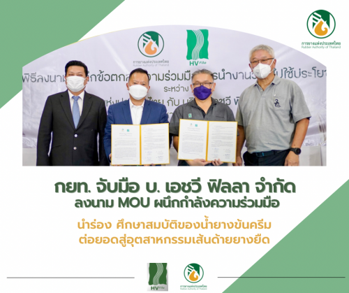 กยท. จับมือ บ. เอชวี ฟิลลา จำกัด ลงนาม MOU ผนึกกำลังความร่วมมือ นำร่อง ศึกษาสมบัติของน้ำยางข้นครีม ต่อยอดสู่อุตสาหกรรมเส้นด้ายยางยืด