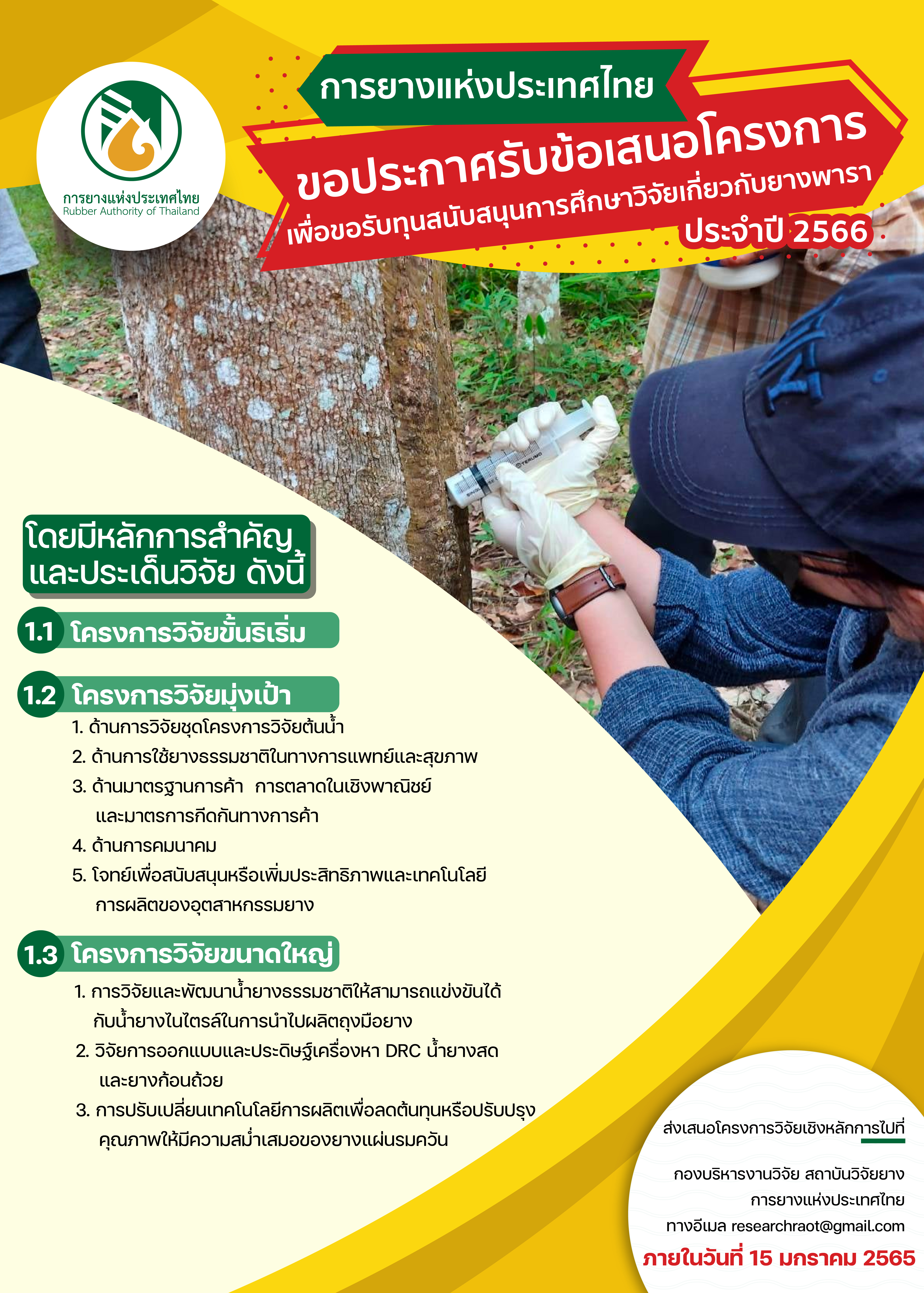 นักวิจัย เฮ!! กยท. เปิดรับข้อเสนอโครงการวิจัย ขอรับทุนสนับสนุนวิจัยด้านยางพารา ประจำปี 2566 ได้ตั้งแต่บัดนี้ ถึง 15 มกราคม 65