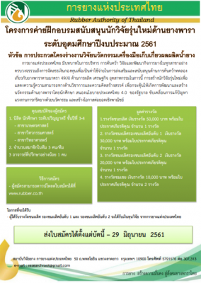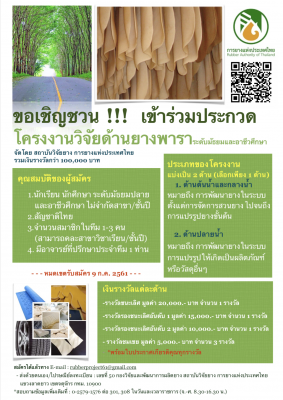 สถาบันวิจัยยาง ขอเชิญเข้าร่วมการประกวดโครงการร่างงานวิจัยนวัตกรรมเครื่องมือเก็บเกี่ยวผลิตน้ำยาง ระหว่างวันที่ 15-29 มิถุนายน 2561