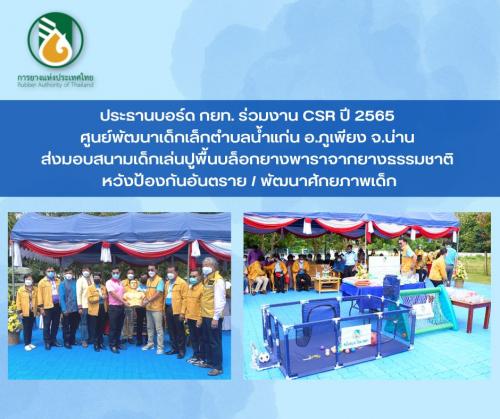 ประธานบอร์ด กยท.ร่วมงาน CSR ปี 2565 ศูนย์พัฒนาเด็กเล็ก ตำบลน้ำแก่น อ.ภูเพียง จ.น่าน ส่งมอบสนามเด็กเล่นปูพื้นบล็อกยางพาราจากยางธรรมชาติ หวังป้องกันอันตราย/พัฒนาศักยภาพเด็ก